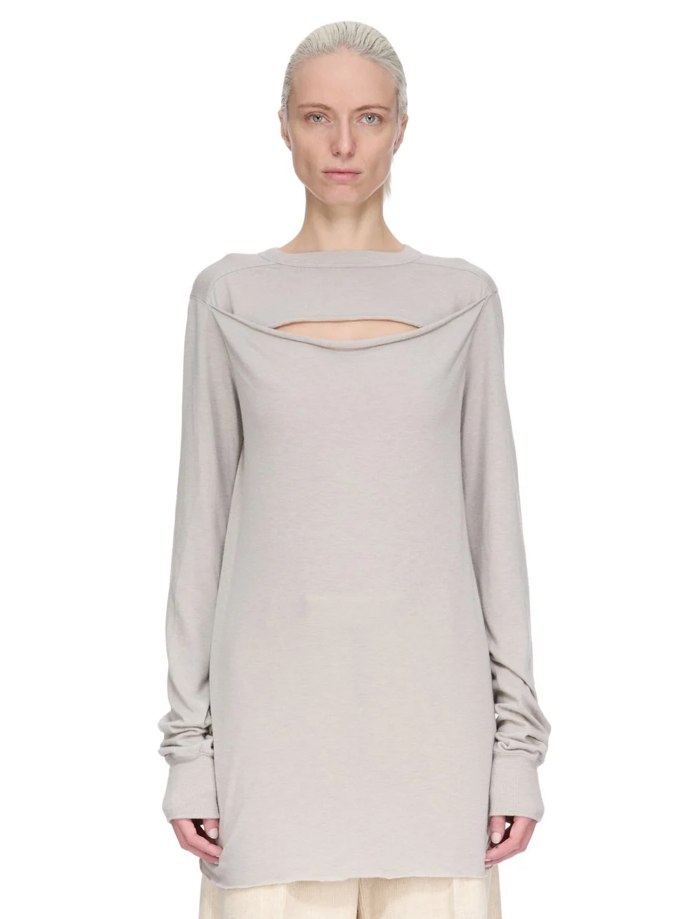 RICK OWENS FW25 CONCORDIANS CALF BIAS SKIRT IN PEARL RAININO JERSEY THIS SLASHED LEVEL LS T IS BELOW HIP LENGTH WITH LONG SLEEVES. IT HAS A RIBBED ROUND NECK AND CUFFS. IT FEATURES A SLASHED FRONT THAT CREATES A SLIGHTLY GAPING OPENING, WITH ROLLED EDGE, ACROSS THE TOP OF THE CHEST. IT FEATURES THE SIGNATURE LEVEL SHOULDER SEAMS AND SINGLE SEAM RUNNING DOWN THE CENTRE BACK SPINE THIS MEDIUMWEIGHT AND FLUID VISCOSE AND WOOL BLEND JERSEY HAS A SOFT, WARM HANDFEEL AND A SLIGHTLY HAIRY SURFACE TEXTURE WE STRIVE TO KEEP OUR PRODUCTION AS LOCAL AS POSSIBLE. THE FULL MANUFACTURING CYCLE OF THIS PRODUCT, FROM THE MATERIAL KNITTING TO SEWING AND FINISHING, WAS UNDERTAKEN CLOSE TO OUR HOME BASE IN CONCORDIA, ITALY THIS JERSEY IS MADE FROM FSC® CERTIFIED VISCOSE AND RWS CERTIFIED WOOL COLOR: PEARL MATERIAL: 30% VISCOSE + 30% NYLON + 20% ANGORA + 20% WOOL MODEL IS 181CM TALL MODEL WEARS SIZE 40