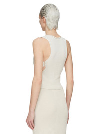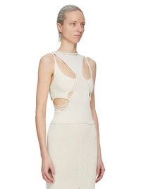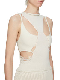 RICK OWENS FW25 CONCORDIANS RUNWAY TANJA TOP IN NATURAL WOOL THIS TANJA TOP IS HIP LENGTH. IT HAS A ROLLED ROUND NECK AND IS SLEEVELESS. IT FEATURES CUT-OUTS ON FRONT CHEST, LOW BUST AND WAIST, WITH A SLIGHTLY SHREDDED SIDE AND A FULL BACK COLOR: NATURAL MATERIAL: 100% NEW WOOL DETAIL 48% ALPACA + 30% NYLON + 20% WOOL + 2% ELASTANE MODEL IS 181CM TALL MODEL WEARS SIZE S