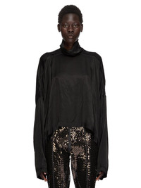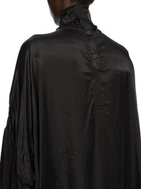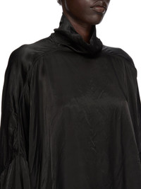 RICK OWENS SS26 TEMPLE JUMBO TABARD IN BLACK CUPRO SATIN THIS JUMBO TABARD CROPPED TOP IS WAIST LENGTH AT FRONT AND HAS A CURVED HEM, DIPPING AT THE SIDES AND HAS AN AMPLE FIT. IT HAS LONG SLEEVES, AND LOW SHOULDER SEAMS. IT FEATURES A HIGH COLLAR WITH A CENTRE BACK OPENING WITH SNAP CLOSURES. THIS LIGHTWEIGHT AND FLUID CUPRO SATIN HAS A GLOSSY SURFACE, A SOFT HANDFEEL AND WASHED FINISH THIS FABRIC IS MADE USING CUPRO WHICH IS BIODEGRADABLE AND 100% PLANT BASED. AS IT’S MADE FROM COTTON WASTE, CUPRO HELPS FIND A PURPOSE TO FIBERS THAT WOULD OTHERWISE BE DISCARDED COLOR: BLACK MATERIAL: 100% CUPRO BUTTONS 100% BUFFALO HORN MODEL IS 181CM TALL ITEM IS AVAILABLE IN ONE SIZE