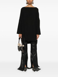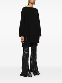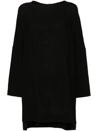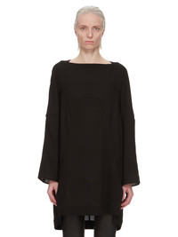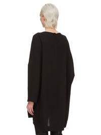 RICK OWENS FW24 PORTERVILLE PHLEG MINI IN BLACK WOOL SABLE THIS PHLEG MINI IS MID-CALF LENGTH, DIPPING SLIGHTLY AT BACK. IT HAS A BOAT NECKLINE, LEVEL SHOULDER SEAMS, AND LONG SLEEVES. IT FEATURES A YOKE AND GIRDERED SEAMS THAT ARC FROM THE CENTRE CHEST, OVER THE SHOULDER AND FINISH IN SQUARE POINTS ON THE UPPER ARM. IT ALSO HAS A GEO SEAM, RUNNING ACROSS THE CHEST AND SLANTING DOWN THE SIDE BODY. IT HAS BEVELED SPLITS AT THE SIDE SEAMS AND A SEAM RUNNING DOWN THE CENTRE FRONT, AND CENTRE BACK SPINE THIS MEDIUMWEIGHT WOOL SABLE FABRIC IS WOVEN WITH HIGH TWIST CREPE YARNS THAT CREATE THE DRY HANDFEEL AND TEXTURED SURFACE. IT IS WOVEN IN THE BIELLA REGION OF ITALY RENOWNED FOR ITS LONG TRADITION OF TAILORED WOOL. THIS FABRIC IS MADE FROM ZQ CERTIFIED VIRGIN WOOL WHICH ENSURES A HIGH STANDARD IN ANIMAL WELFARE, ENVIRONMENTAL SUSTAINABILITY AND SOCIAL RESPONSIBILITY. EACH BALE OF WOOL IS TRACEABLE BACK TO ITS SOURCE - COLOR: BLACK - MATERIAL: 100% NEW WOOL - MODEL IS 181CM TALL - MODEL WEARS SIZE 40