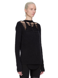 RICK OWENS FW25 CONCORDIANS CARGOBELAS IN BLACK ALPACA GRID KNIT THIS LS TOP IS HIP LENGTH. THIS LONG SLEEVE TOP FEATURES OUR OPEN RIB KNIT, HAS A SLIGHT BOAT NECK, AND IS BODY REVEALING ON FRONT CHEST. IT HAS A SIGNATURE CHANNEL DOWN THE CENTRE BACK THIS A DENSE BUT LIGHT KNIT WITH A SOFT SLIGHTLY FLUFFY HAND IT IS KNITTED IN AN OPEN RIB PATTERN THAT VARIES THROUGHOUT THE GARMENT COLOR: BLACK MATERIAL: 48% ALPACA + 30% NYLON + 20% WOOL + 2% ELASTANE MODEL IS 181CM TALL MODEL WEARS SIZE S