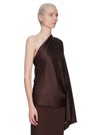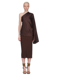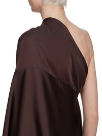 RICK OWENS SS25 HOLLYWOOD ONE SLEEVE TOP IN MAHOGANY WASHED CHARMEUSE THIS LONG SLEEVE TOP IS HIP LENGTH. IT HAS A LOOSE FIT, WITH ONE ASYMMETRICAL SHOULDER WITH DRAPING, ACROSS THE BODY AND ONE LONG SLEEVE. IT IS BIAS CUT WITH A DIAGONAL SEAM ENCIRCLING THE GARMENT. IT CAN BE SWITCHED AND WORN IN THE OPPOSITE DIRECTION, SWITCHING THE ARM AND BODY. IT THEN FALLS TO MID-THIGH LENGTH. THIS LIGHTWEIGHT AND FLUID CHARMEUSE HAS A SEMI-SHINY SURFACE AND WASHED FINISH. THIS FABRIC IS MADE FROM CERTIFIED VISCOSE WHICH ENSURES THAT THE FIBERS ARE PRODUCED FROM RESPONSIBLY MANAGED SOURCES AND NO DEFORESTATION OCCURS COLOR: MAHOGANY MATERIAL: 61% ACETATE + 39% VISCOSE MODEL IS 181CM TALL MODEL WEARS SIZE 40