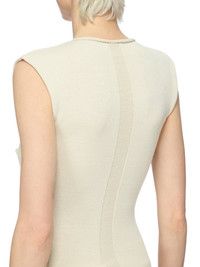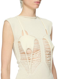 RICK OWENS FW25 CONCORDIANS RUNWAY TANJA TOP IN NATURAL WOOL THIS TANJA TOP IS HIP LENGTH. IT HAS A ROLLED ROUND NECK WITH CAP SLEEVES. IT FEATURES CUT-OUTS ON FRONT CHEST, AND BUST, WITH A SLIGHTLY SHREDDED FRONT AND A FULL BACK WITH A CENTRE BACK CHANNEL DOWN THE SPINE. IT IS BODY REVEALING ON FRONT COLOR: NATURAL MATERIAL: 100% NEW WOOL DETAIL 48% ALPACA + 30% NYLON + 20% WOOL + 2% ELASTANE MODEL IS 181CM TALL MODEL WEARS SIZE S