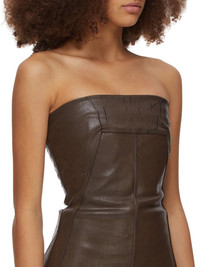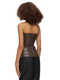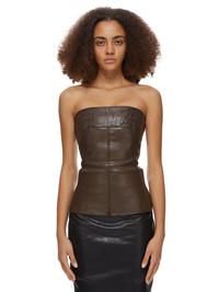RICK OWENS FW23 LUXOR BUSTIER TOP IN BROWN CRACKED STRETCH DENIM THIS BUSTIER TOP IS HIP LENGTH WITH A CLOSE TO THE BODY FIT. ITS STRAPLESS BUSTIER TOP HAS A SIGNATURE GEO SEAM RUNNING ACROSS THE FRONT CHEST AND SLANTING DIAGONALLY DOWN THE SIDE BODY. IT HAS AN EXPOSED CENTRE BACK ZIPPER AND RAW CUT HEM.THIS LIGHTWEIGHT STRETCH DENIM HAS A SOFT, MATTE FILM OVERLAY. AFTER THE DENIM BASE IS OVER DYED AND COATED WITH A DARK GLUE, THE FILM IS APPLIED BY HEAT PRESS AND TUMBLED TO CREATE THE SOFT HAND FEEL AND CRACKED EFFECT. SINCE THE FILM IS APPLIED DIRECTLY ON THE READY GARMENT, SEAMS AND DETAILS MAKE THE APPLICATION IRREGULAR, EXPOSING THE UNDERLYING DENIM IN CERTAIN AREAS. THIS IS AN INHERENT CHARACTERISTIC OF THIS TYPE OF TREATMENT AND IS A DESIRED VISUAL ASPECT WHICH MAKES EACH PIECE UNIQUE - COLOR: BROWN - MATERIAL: 91% COTTON + 6% ELASTOMULTIESTER + 3% RUBBER - INNER BUSTIER 78% NYLON + 22% ELASTANE - MODEL IS 181CM TALL - MODEL WEARS SIZE 40