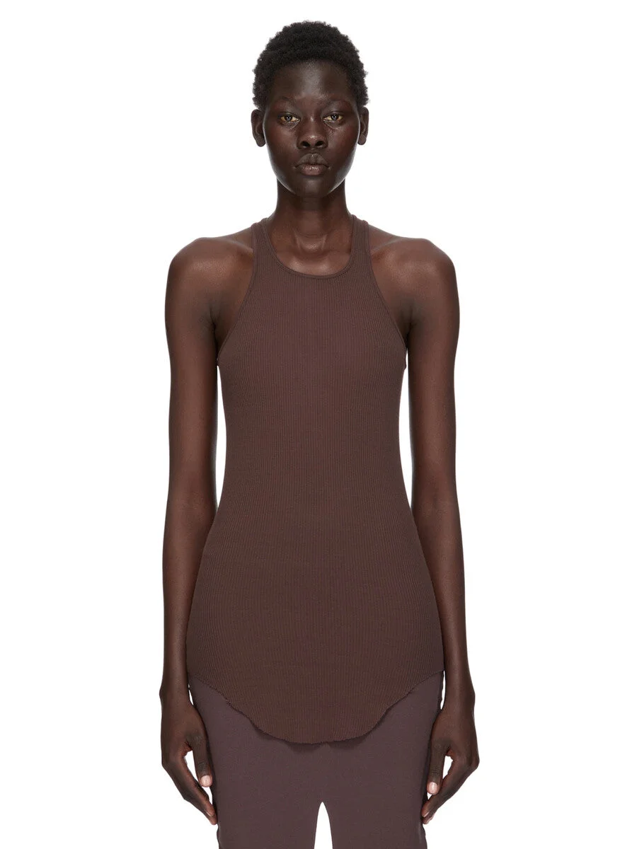 RICK OWENS SS26 TEMPLE BASIC RIB TANK IN MACASSAR VISCOSE SILK RIB JERSEY THIS BASIC RIB TANK IS HIP LENGTH WITH A ROUNDED RAW CUT HEM THAT DIPS IN FRONT AND BACK. IT HAS A ROUND NECKLINE AND THIN SHOULDER STRAPS THAT FLOW INTO A SLIGHT RACER BACK. IT FEATURES THE SIGNATURE SINGLE SEAM RUNNING DOWN THE CENTER BACK SPINE. THIS LIGHTWEIGHT VISCOSE AND SILK RIB JERSEY HAS A DISTINCT RIB PATTERN AND SOFT HANDFEEL. THIS JERSEY IS MADE FROM FSC® (FSC – C162846) CERTIFIED VISCOSE WHICH ENSURES THAT THE FIBERS ARE PRODUCED FROM RESPONSIBLY MANAGED SOURCES AND NO DEFORESTATION OCCURS. WE STRIVE TO KEEP OUR PRODUCTION AS LOCAL AS POSSIBLE. THE FULL MANUFACTURING CYCLE OF THIS PRODUCT, FROM THE MATERIAL KNITTING TO SEWING AND FINISHING, WAS UNDERTAKEN CLOSE TO OUR HOME BASE IN CONCORDIA, ITALY. COLOR: MACASSAR MATERIAL:88% VISCOSE + 12% SILK MODEL IS 181CM TALL MODEL WEARS SIZE 40