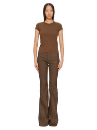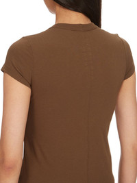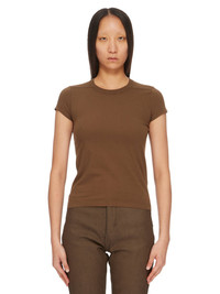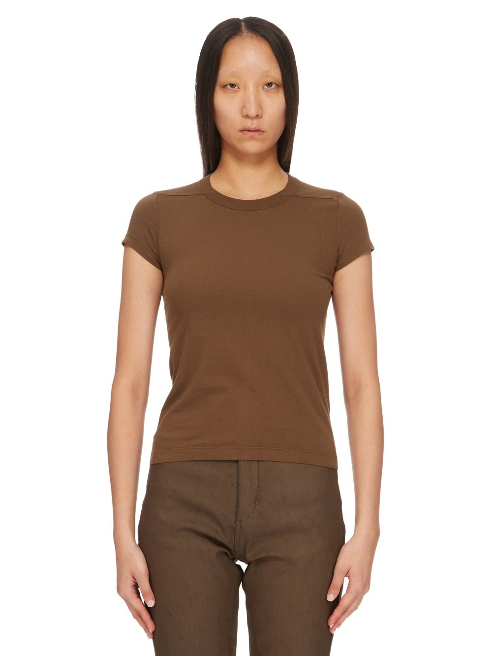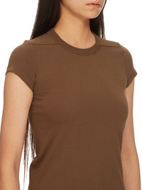 RICK OWENS FW24 PORTERVILLE CROPPED LEVEL T IN BEAN CLASSIC COTTON JERSEY THIS CROPPED LEVEL T IS ABOVE HIP-LENGTH WITH SHORT SLEEVES, AND A SLIM FIT. IT HAS A RIBBED CREWNECK AND SIGNATURE LEVEL SHOULDER SEAMS AND SINGLE SEAM RUNNING DOWN THE CENTRE BACK SPINE THIS MEDIUMWEIGHT CLASSIC COTTON JERSEY IS COMPACT WITH A DRY HANDFEEL. THIS JERSEY IS MADE USING GOTS CERTIFIED ORGANIC COTTON WHICH MEANS THE NATURAL FIBER IS GROWN WITHOUT HARMFUL CHEMICALS, LEAVING OUR SOIL, AIR AND WATER CLEANER FROM CONTAMINATES WE STRIVE TO KEEP OUR PRODUCTION AS LOCAL AS POSSIBLE. THE FULL MANUFACTURING CYCLE OF THIS PRODUCT, FROM THE MATERIAL KNITTING TO SEWING AND FINISHING, WAS UNDERTAKEN CLOSE TO OUR HOME BASE IN CONCORDIA, ITALY. - COLOR: BEAN - MATERIAL: 100% COTTON - MODEL IS 181CM TALL - MODEL WEARS SIZE 40