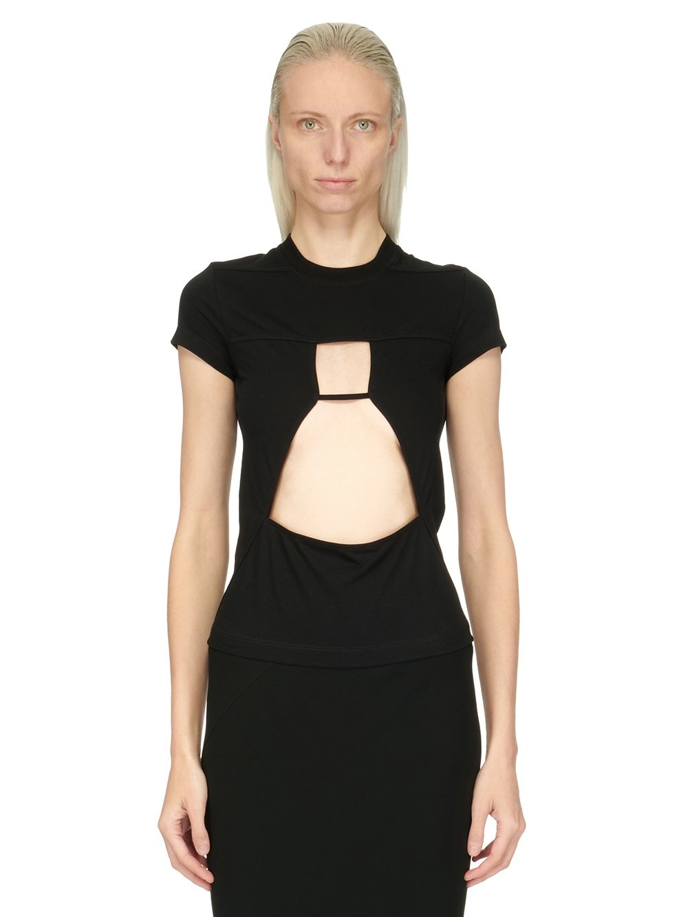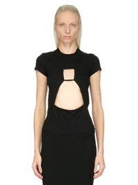 RICK OWENS FW23 LUXOR COMBO JERSEY T IN BLACK CLASSIC COTTON JERSEY THIS COMBO JERSEY T IS ABOVE HIP LENGTH WITH SHORT SLEEVES AND A SLIM FIT. IT HAS A RIBBED CREWNECK AND SIGNATURE LEVEL SHOULDER SEAMS AND SINGLE SEAM RUNNING DOWN THE CENTRE BACK SPINE. IT FEATURES A GEOMETRIC CUT OUT ON THE FRONT BODY THIS MEDIUMWEIGHT CLASSIC COTTON JERSEY IS COMPACT WITH A DRY HANDFEEL. THIS JERSEY IS MADE USING GOTS CERTIFIED ORGANIC COTTON WHICH MEANS THE NATURAL FIBER IS GROWN WITHOUT HARMFUL CHEMICALS, LEAVING OUR SOIL, AIR AND WATER CLEANER FROM CONTAMINATES WE STRIVE TO KEEP OUR PRODUCTION AS LOCAL AS POSSIBLE. THE FULL MANUFACTURING CYCLE OF THIS PRODUCT, FROM THE MATERIAL KNITTING TO SEWING AND FINISHING, WAS UNDERTAKEN CLOSE TO OUR HOME BASE IN CONCORDIA, ITALY. - COLOR: BLACK - MATERIAL: 100% COTTON - MODEL IS WEARING SIZE 40 - MODEL IS 181 CM TALL