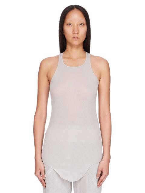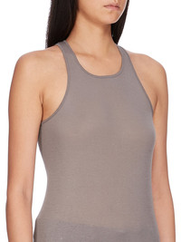 RICK OWENS FW25 CONCORDIANS BASIC RIB TANK IN DUST MINI RIB JERSEY THIS BASIC RIB TANK IS HIP LENGTH WITH A ROUNDED RAW CUT HEM THAT DIPS IN FRONT AND BACK. IT HAS A ROUND NECKLINE AND THIN SHOULDER STRAPS THAT FLOW INTO A SLIGHT RACER BACK. IT FEATURES THE SIGNATURE SINGLE SEAM RUNNING DOWN THE CENTRE BACK SPINE THIS LIGHTWEIGHT MINI RIB JERSEY HAS A TEXTURED SURFACE AND SOFT HANDFEEL THIS JERSEY IS MADE USING GOTS CERTIFIED ORGANIC COTTON WHICH MEANS THE NATURAL FIBER IS GROWN WITHOUT HARMFUL CHEMICALS, LEAVING OUR SOIL, AIR AND WATER CLEANER FROM CONTAMINATES WE STRIVE TO KEEP OUR PRODUCTION AS LOCAL AS POSSIBLE. THE FULL MANUFACTURING CYCLE OF THIS PRODUCT, FROM THE MATERIAL KNITTING TO SEWING AND FINISHING, WAS UNDERTAKEN CLOSE TO OUR HOME BASE IN CONCORDIA, ITALY COLOR: DUST MATERIAL: 100% COTTON MODEL IS 181CM TALL MODEL WEARS SIZE 40