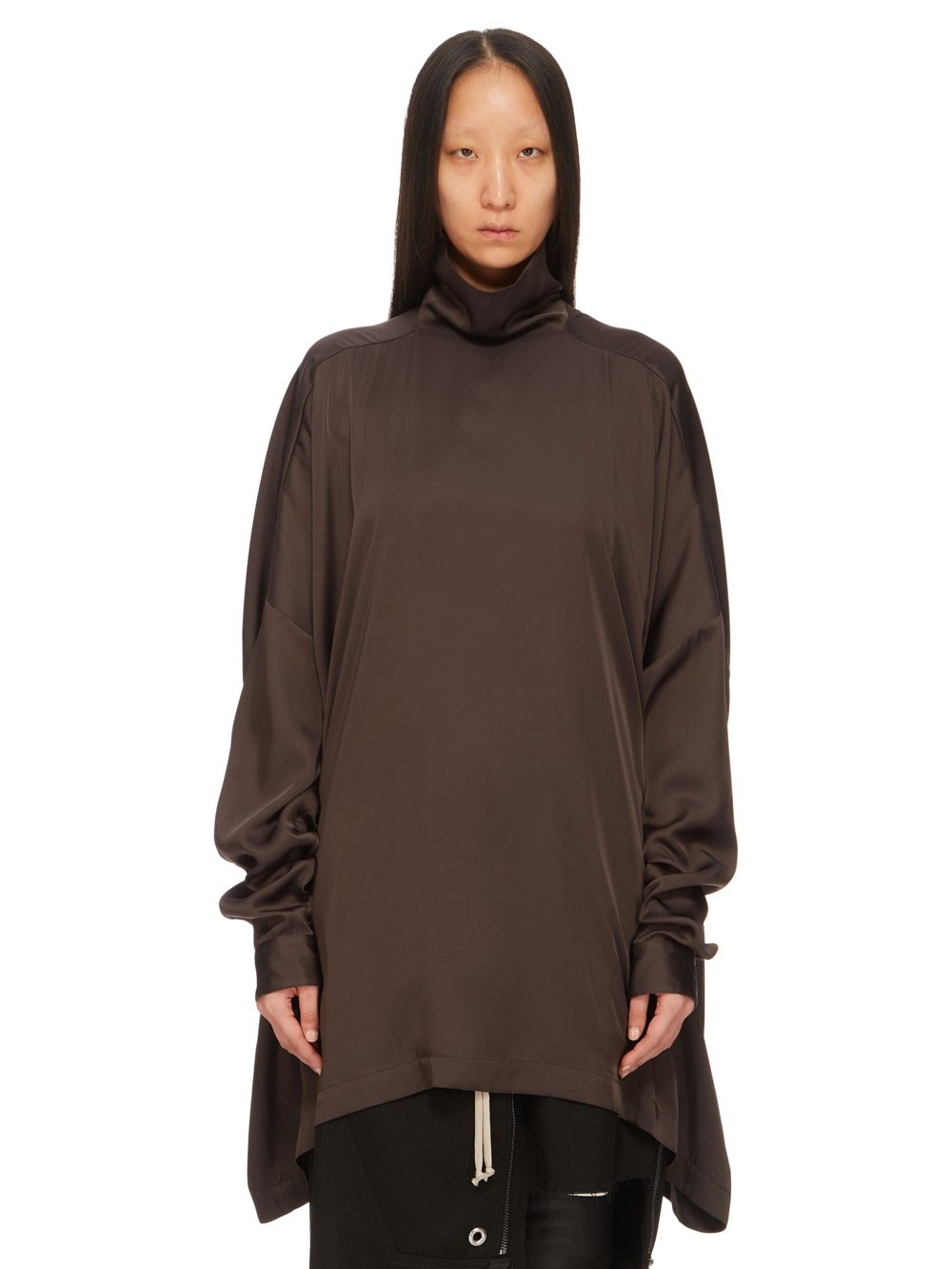 RICK OWENS FW24 PORTERVILLE JUMBO TABARD TOP IN DARK DUST WASHED CHARMEUSE THIS JUMBO TABARD TOP IS HIP-LENGTH WITH A JUMBO BOXY FIT. IT HAS WIDE SHOULDERS WITH LEVEL SHOULDER SEAMS, LONG SLEEVES WITH BUTTONED CUFFS AND FEATURES A HIGH TUBE COLLAR WITH A CENTRE BACK BUTTONED OPENING THIS LIGHTWEIGHT AND FLUID CHARMEUSE IS HAS A SEMI-SHINY SURFACE AND WASHED FINISH. THIS FABRIC IS MADE FROM FSC® CERTIFIED VISCOSE WHICH ENSURES THAT THE FIBERS ARE PRODUCED FROM RESPONSIBLY MANAGED SOURCES AND NO DEFORESTATION OCCURS - COLOR: DARK DUST - MATERIAL: 61% ACETATE + 39% VISCOSE - MODEL IS 181CM TALL - ITEMS IS AVAILABLE IN ONE SIZE