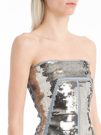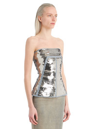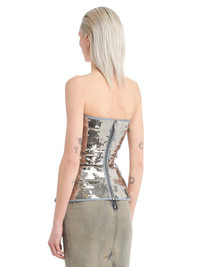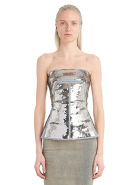RICK OWENS FW22 STROBE RUNWAY BUSTIER TOP IN BLUE AND SILVER SEQUIN EMBROIDERED STRETCH DENIM THIS BUSTIER TOP IS HIP-LENGTH WITH A CLOSE-TO-THE-BODY FIT. IT HAS A STRAPLESS BUSTIER TOP, WITH A SIGNATURE GEO SEAM RUNNING ACROSS THE FRONT CHEST AND SLANTING DIAGONALLY DOWN THE SIDE BODY. IT HAS A CENTRE BACK ZIPPER THIS VERSION IS MADE FROM SEQUIN EMBROIDERED STRETCH DENIM, AN ENGINEERED TECHNIQUE WHERE EACH OF THE GARMENTS' PANELS IS EMBROIDERED SEPARATELY BEFORE CONSTRUCTION, LEAVING SLIGHT TRACING OF THE DENIM UNDERNEATH VISIBLE AROUND THE SEAM LINES THIS LIGHTWEIGHT STRETCH DENIM IS EMBROIDERED WITH SMALL ORNAMENTAL SEQUIN DISKS - COLOR: BLUE/SILVER - MATERIAL: 91% COTTON + 6% ELASTOMULTIESTER + 3% RUBBER - INNER BUSTIER 78% NYLON + 22% ELASTANE - EMBROIDERY 100% POLYESTER - MODEL IS WEARING SIZE 40 - MODEL IS 181 CM TALL