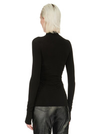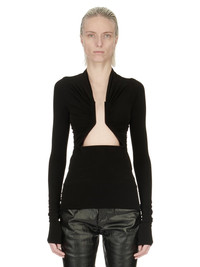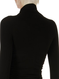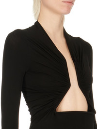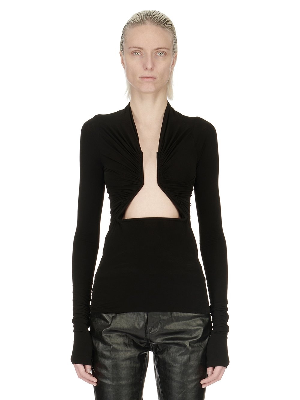RICK OWENS SS24 LIDO LS PRONG IN BLACK HEAVY STRETCH CUPRO JERSEY THIS LS PRONG REACHES HIGH ON THE THIGH AND HAS LONG SLEEVES. IT HAS A RUCHED BODY GATHERING INTO THE BUST, THAT FEATURES A BONED GEOMETRIC CUT-OUT FRONT AND A TIGHT-FITTING SKIRT THIS MEDIUMWEIGHT CUPRO JERSEY IS STRETCHY WITH A SOFT AND COOL HANDFEEL. THIS JERSEY IS MADE USING CUPRO WHICH IS BIODEGRADABLE AND 100% PLANT BASED. AS IT’S MADE FROM COTTON WASTE, CUPRO HELPS FIND A PURPOSE TO FIBERS THAT WOULD OTHERWISE BE DISCARDED - COLOR: BLACK - MATERIAL: 96% CUPRO + 4% ELASTANE - MODEL IS 181CM TALL - MODEL WEARS SIZE 38