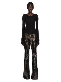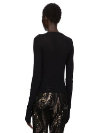 RICK OWENS SS26 TEMPLE CROPPED RIB LS IN BLACK VISCOSE SILK RIB JERSEY THIS CROPPED RIB LS T IS ABOVE HIP LENGTH WITH A SLIM FIT AND LONG SLEEVES. IT HAS A RIBBED ROUND NECK, RAW CUT HEM AND CUFFS, AND FEATURES THE SIGNATURE SINGLE SEAM RUNNING DOWN CENTRE BACK SPINE. THIS LIGHTWEIGHT VISCOSE AND SILK RIB JERSEY HAS A DISTINCT RIB PATTERN AND SOFT HANDFEEL. THIS JERSEY IS MADE FROM FSC® (FSC – C162846) CERTIFIED VISCOSE WHICH ENSURES THAT THE FIBERS ARE PRODUCED FROM RESPONSIBLY MANAGED SOURCES AND NO DEFORESTATION OCCURS. WE STRIVE TO KEEP OUR PRODUCTION AS LOCAL AS POSSIBLE. THE FULL MANUFACTURING CYCLE OF THIS PRODUCT, FROM THE MATERIAL KNITTING TO SEWING AND FINISHING, WAS UNDERTAKEN CLOSE TO OUR HOME BASE IN CONCORDIA, ITALY. COLOR: BLACK MATERIAL:88% VISCOSE + 12% SILK MODEL IS 181CM TALL MODEL WEARS SIZE 40