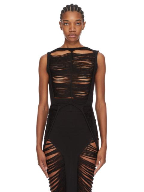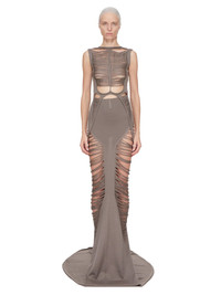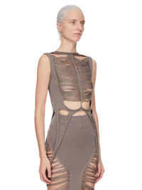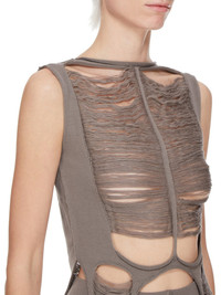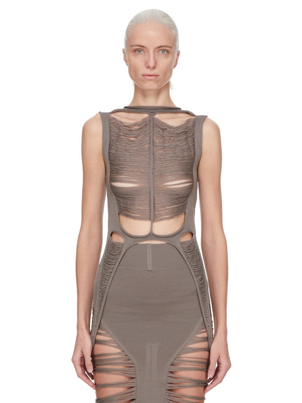 RICK OWENS SS25 HOLLYWOOD RUNWAY TANJA T IN DUST SHREDDED MERINO KNIT THIS TANJA T IS WAIST LENGTH AT FRONT AND SLIGHTLY LONGER IN THE BACK. IT HAS A ROLLED BOAT NECK AND IS SLEEVELESS. THIS SLEEVELESS TOP FEATURES A SHREDDED FRONT AND BACK, WITH SIDE LOOPS THAT HANG DOWN TO BELOW HIP LENGTH, A CENTRE FRONT LINE AND DOUBLE AND BACK PANELS. IT IS BODY REVEALING ON FRONT AND BACK THIS MEDIUMWEIGHT WOOL KNIT HAS A SOFT HANDFEEL. IT IS KNITTED IN AN OPEN RIB PATTERN THAT VARIES THROUGHOUT THE GARMENT. COLOR: DUST MATERIAL: 100% NEW WOOL MODEL IS 181CM TALL MODEL WEARS SIZE S