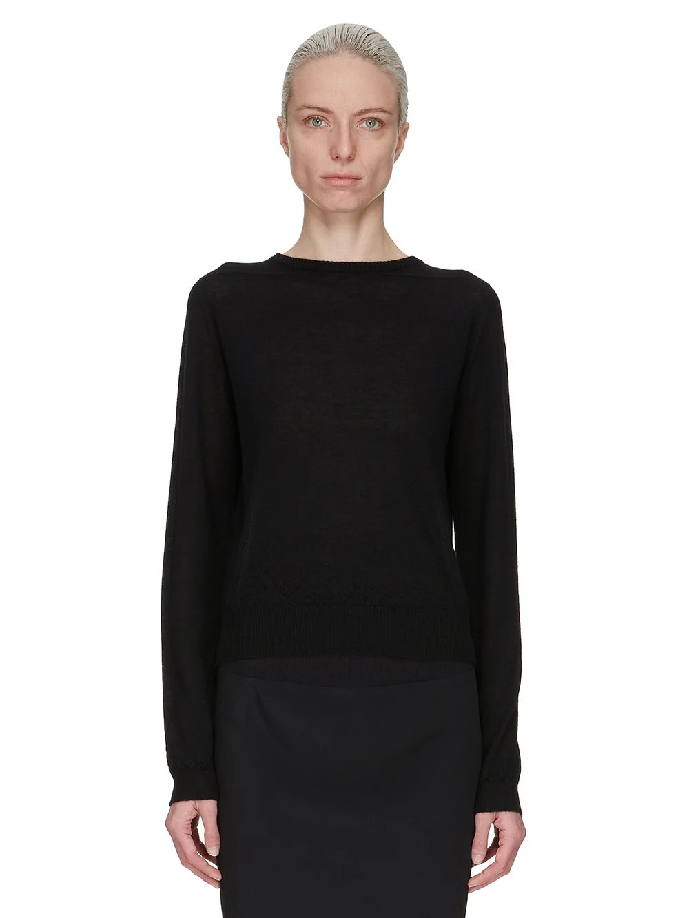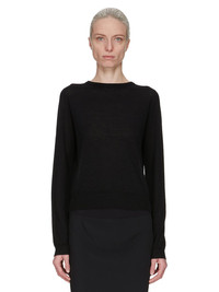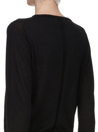 RICK OWENS SS25 HOLLYWOOD BIKER LEVEL IN BLACK LIGHT WEIGHT RASATO KNIT THIS BIKER LEVEL ROUND NECK SWEATER IS ABOVE-HIP LENGTH WITH LONG SLEEVES. IT HAS A RIBBED ROUND NECK, CUFFS AND HEM. IT FEATURES SIGNATURE LEVEL SHOULDER SEAMS AND A KNIT LINE RUNNING DOWN THE CENTER BACK SPINE THIS LIGHTWEIGHT AND CLASSIC STITCH CASHMERE KNIT HAS A SOFT HANDFEEL COLOR: BLACK MATERIAL: 100% CASHMERE MODEL IS 181CM TALL MODEL WEARS SIZE S