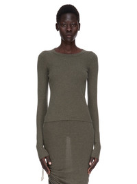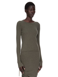 RICK OWENS FW25 CONCORDIANS CROPPED RIB LS T IN BOSCO RAININO RIB JERSEY THIS CROPPED RIB LS T IS ABOVE HIP LENGTH WITH A SLIM FIT AND LONG SLEEVES. IT HAS A RIBBED ROUND NECK, RAW CUT HEM AND CUFFS, AND FEATURES THE SIGNATURE SINGLE SEAM RUNNING DOWN CENTRE BACK SPINE THIS MEDIUMWEIGHT AND FLUID VISCOSE AND WOOL BLEND RIB JERSEY HAS A SOFT, WARM HANDFEEL AND A SLIGHTLY HAIRY SURFACE TEXTURE WE STRIVE TO KEEP OUR PRODUCTION AS LOCAL AS POSSIBLE. THE FULL MANUFACTURING CYCLE OF THIS PRODUCT, FROM THE MATERIAL KNITTING TO SEWING AND FINISHING, WAS UNDERTAKEN CLOSE TO OUR HOME BASE IN CONCORDIA, ITALY THIS JERSEY IS MADE FROM FSC® CERTIFIED VISCOSE AND RWS CERTIFIED WOOL COLOR: BOSCO MATERIAL: 30% VISCOSE + 30% NYLON + 20% ANGORA + 20% WOOL MODEL IS 181CM TALL MODEL WEARS SIZE 40