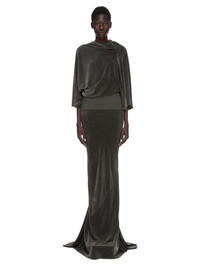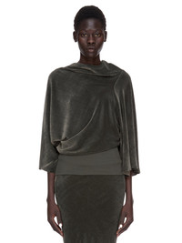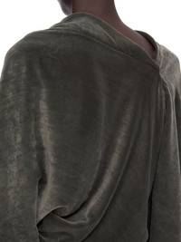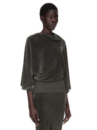 RICK OWENS FW25 CONCORDIANS CYLINDER TOP IN BOSCO VELVET THIS CYLINDER TOP IS HIP-LENGTH, WITH A DRAPED BIAS CUT BODY, ELBOW-LENGTH WIDE SLEEVES AND A HIGH DRAPED COWL NECK THAT HAS AN ASYMMETRICAL OPENING AT BACK. IT GATHERS INTO THE WAIST AND FINISHES IN A TIGHT BODY TO THE HIP THIS LIGHTWEIGHT AND FLUID VELVET HAS A SOFT AND WASHED UNEVEN FINISH THIS FABRIC IS MADE FROM FSC® CERTIFIED VISCOSE WHICH ENSURES THAT THE FIBERS ARE PRODUCED FROM RESPONSIBLY MANAGED SOURCES AND NO DEFORESTATION OCCURS COLOR: BOSCO MATERIAL: 82% VISCOSE + 18% SILK BOTTOM 100% COTTON MODEL IS 181CM TALL MODEL WEARS SIZE 40