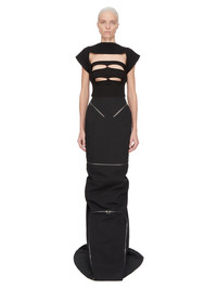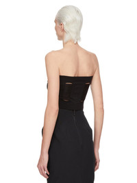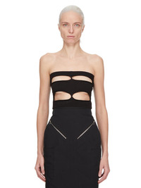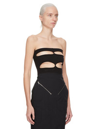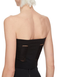 RICK OWENS SS25 HOLLYWOOD RUNWAY TANJA BANDEAU IN BLACK SHREDDED MERINO KNIT THIS TANJA BANDEAU IS A BUSTIER TYPE TOP AND IS CROPPED WAIST LENGTH AT FRONT AND IS SLIGHTLY LONGER IN BACK. IT FEATURES A KNIT BAND ACROSS THE BUST AND WAIST AND HAS FOUR CUT OUTS ON FRONT AND A SHREDDED BACK. IT IS BODY REVEALING ON FRONT AND BACK. THIS MEDIUMWEIGHT WOOL KNIT HAS A SOFT HANDFEEL. IT IS KNITTED IN AN OPEN RIB PATTERN THAT VARIES THROUGHOUT THE GARMENT. COLOR: BLACK MATERIAL: 100% NEW WOOL MODEL IS 181CM TALL MODEL WEARS SIZE S