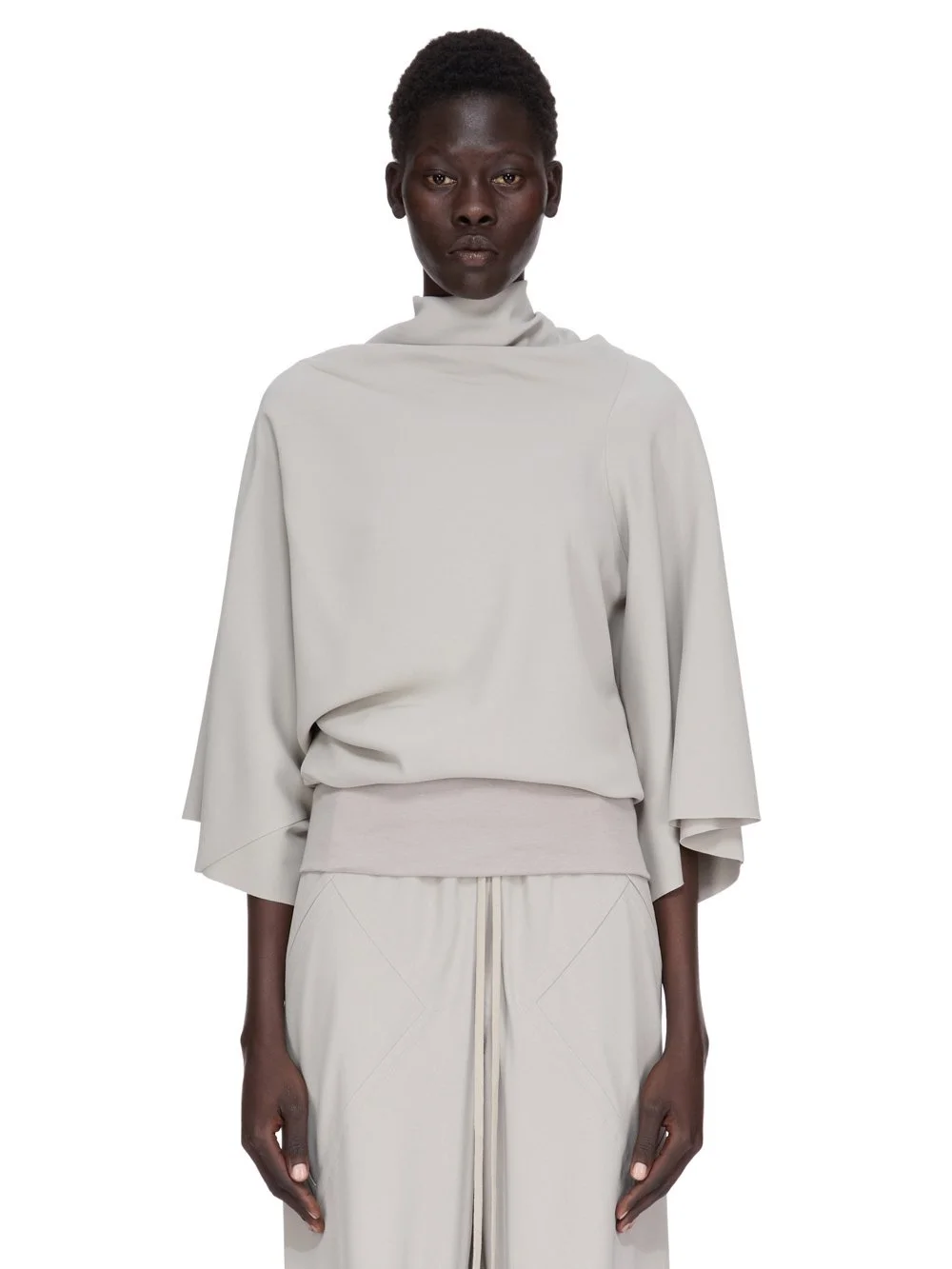 RICK OWENS FW25 CONCORDIANS CYLINDER TOP IN PEARL HEAVY CADY THIS CYLINDER TOP IS HIP-LENGTH, WITH A DRAPED BIAS CUT BODY, ELBOW-LENGTH WIDE SLEEVES AND A HIGH DRAPED COWL NECK THAT HAS AN ASYMMETRICAL OPENING AT BACK. IT GATHERS INTO THE WAIST AND FINISHES IN A TIGHT BODY TO THE HIP THIS MEDIUMWEIGHT CADY CREPE IS FLUID WITH A CRISP SURFACE TEXTURE AND A COOL SLICK BACKSIDE THIS FABRIC IS MADE FROM FSC® CERTIFIED VISCOSE AND ACETATE WHICH ENSURES THAT THE FIBERS ARE PRODUCED FROM RESPONSIBLY MANAGED SOURCES AND NO DEFORESTATION OCCURS COLOR: PEARL MATERIAL: 53% VISCOSE + 47% ACETATE BOTTOM 100% COTTON MODEL IS 181CM TALL MODEL WEARS SIZE 40