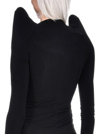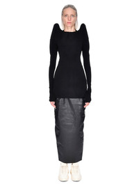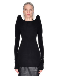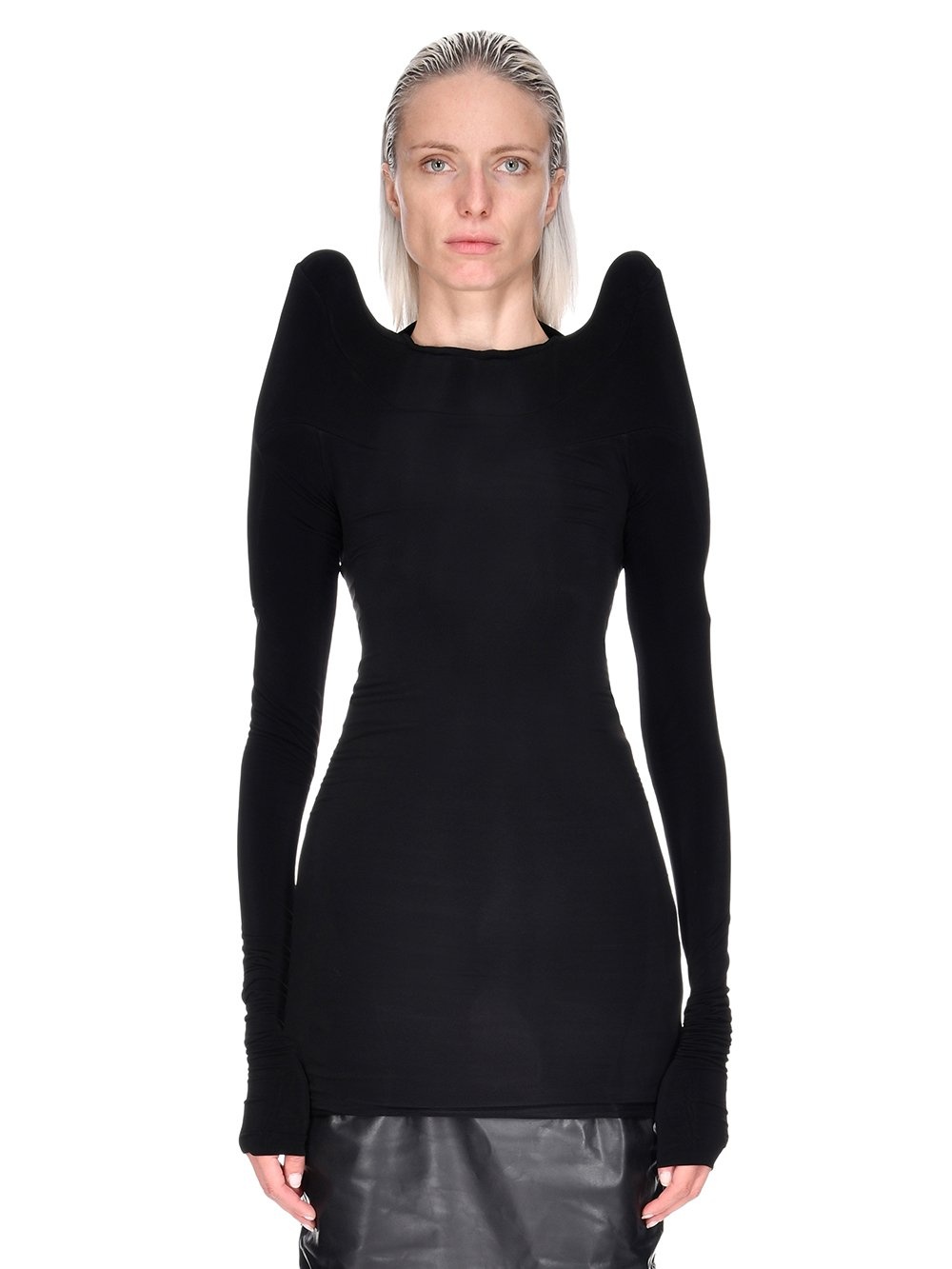 RICK OWENS FW22 STROBE RUNWAY TEC T IN BLACK STRETCH CUPRO JERSEY THIS TEC T IS BELOW HIP LENGTH WITH A CLOSE FIT. IT HAS AN ANGULAR BOAT NECK, GIRDERED YOKE AND FEATURES EXAGGERATED TEC SHOULDERS WHICH RISE INTO ROUNDED POINTS. IT HAS LONG SLEEVES THAT GATHER AT THE WRIST AND THE SIGNATURE SINGLE SEAM RUNNING DOWN THE CENTRE BACK SPINE A STRETCHY AND DRAPEY LIGHTWEIGHT JERSEY WITH A COOL TOUCH. WE CHOSE CUPRO FOR THIS PRODUCT BECAUSE CUPRO FIBER IS BIODEGRADABLE AND 100% PLANT BASED. AS IT’S MADE FROM COTTON WASTE, CUPRO HELPS FIND A PURPOSE TO FIBERS THAT WOULD OTHERWISE BE DISCARDED - COLOR: BLACK - MATERIAL: 92% CUPRO + 8% ELASTANE - MODEL IS WEARING SIZE 40 - MODEL IS 181 CM TALL