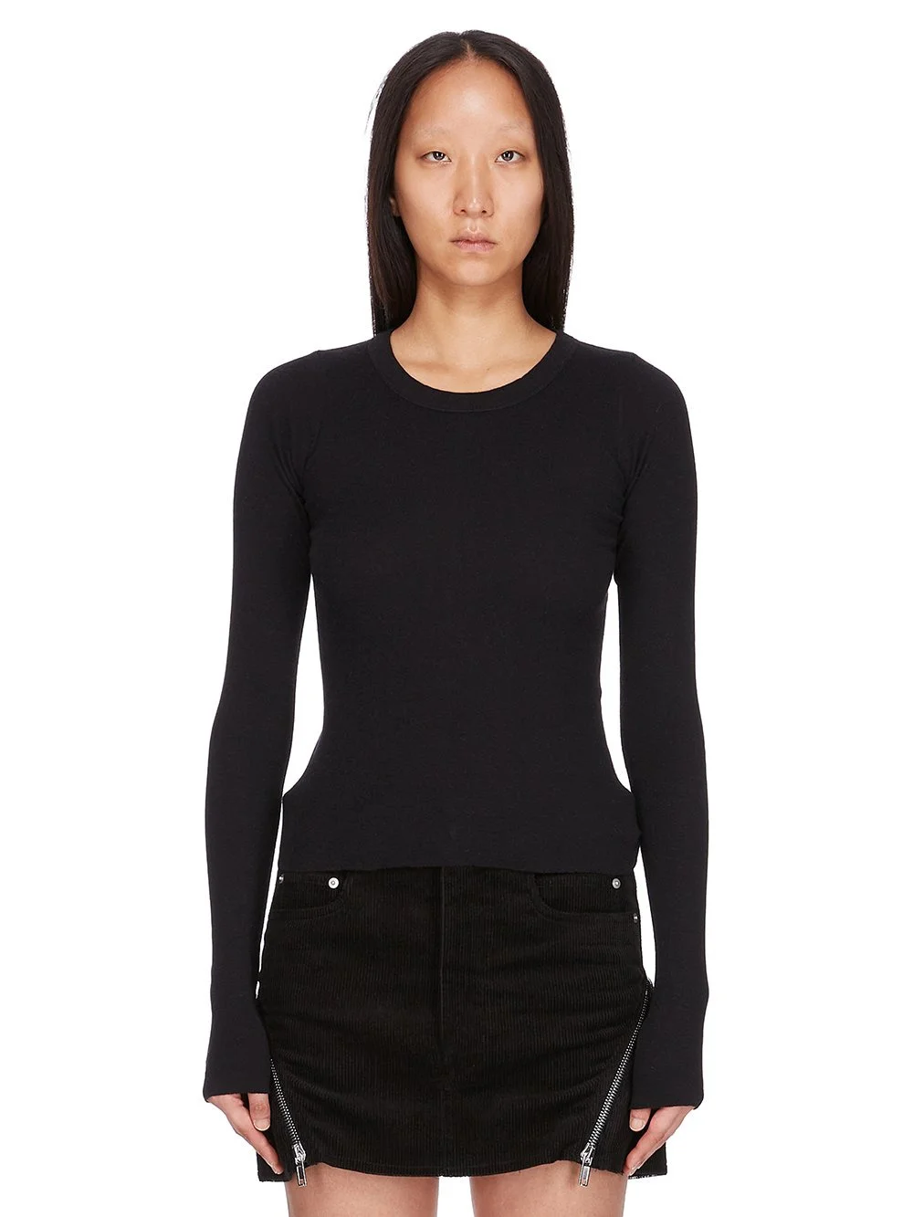 RICK OWENS FW25 CONCORDIANS CROPPED RIB LS T IN BLACK RAININO RIB JERSEY THIS CROPPED RIB LS T IS ABOVE HIP LENGTH WITH A SLIM FIT AND LONG SLEEVES. IT HAS A RIBBED ROUND NECK, RAW CUT HEM AND CUFFS, AND FEATURES THE SIGNATURE SINGLE SEAM RUNNING DOWN CENTRE BACK SPINE THIS MEDIUMWEIGHT AND FLUID VISCOSE AND WOOL BLEND RIB JERSEY HAS A SOFT, WARM HANDFEEL AND A SLIGHTLY HAIRY SURFACE TEXTURE WE STRIVE TO KEEP OUR PRODUCTION AS LOCAL AS POSSIBLE. THE FULL MANUFACTURING CYCLE OF THIS PRODUCT, FROM THE MATERIAL KNITTING TO SEWING AND FINISHING, WAS UNDERTAKEN CLOSE TO OUR HOME BASE IN CONCORDIA, ITALY THIS JERSEY IS MADE FROM FSC® CERTIFIED VISCOSE AND RWS CERTIFIED WOOL COLOR: BLACK MATERIAL: 30% VISCOSE + 30% NYLON + 20% ANGORA + 20% WOOL MODEL IS 181CM TALL MODEL WEARS SIZE 40