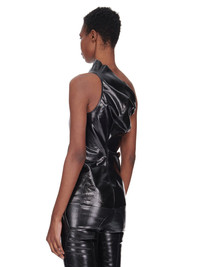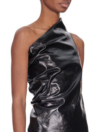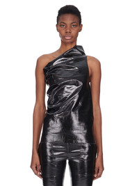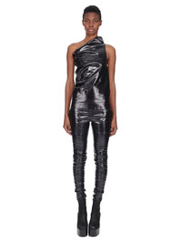 RICK OWENS FW22 STROBE ATHENA TANK IN LACQUERED STRETCH DENIM THIS ATHENA TANK IS HIP LENGTH AND FEATURES AN ASYMMETRICAL NECKLINE WITH DRAPING ACROSS THE BODY, AND HAS ONE-SLEEVELESS SHOULDER WHICH CAN BE WORN UP ON THE SHOULDER OR DOWN TO CREATE AN OFF THE SHOULDER TOP. IT FEATURES THE SIGNATURE SEAM RUNNING DOWN THE CENTRE BACK SPINE AND RAW CUT HEM THIS STRETCH DENIM IS TREATED WITH A WATER-BASED GLOSSY LACQUER FINISH - COLOR: BLACK - MATERIAL: 91% COTTON + 6% ELASTOMULTIESTER + 3% RUBBER - MODEL IS WEARING SIZE 40 - MODEL IS 181 CM TALL