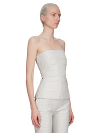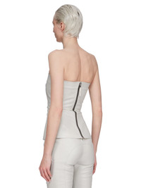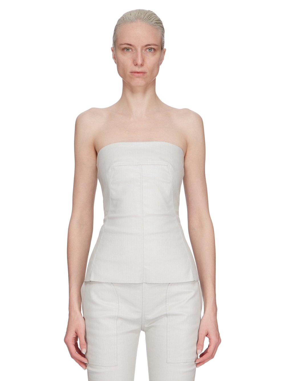 RICK OWENS SS25 HOLLYWOOD BUSTIER TOP IN DINGE COATED STRETCH DENIM THIS BUSTIER TOP IS HIP LENGTH WITH A CLOSE TO THE BODY FIT. ITS STRAPLESS BUSTIER TOP HAS A SIGNATURE GEO SEAM RUNNING ACROSS THE FRONT CHEST AND SLANTING DIAGONALLY DOWN THE SIDE BODY. IT HAS A CENTER BACK ZIPPER AND RAW CUT HEM THIS LIGHTWEIGHT STRETCH DENIM IS COVERED WITH A SEMI-SHINY AND SOFT COATING. THE INDIGO COLOR AND STRUCTURE OF THE DENIM SHINES THROUGH THE COLOR OF THE COATING CREATING A MULTILAYERED AND IRREGULAR COLORATION. THE NATURAL ASPECTS OF THIS FABRIC MEANS THE COATING HAS PEELED OFF IN CERTAIN AREAS, EXPOSING THE UNDERLAYING MATERIAL AND WILL CONTINUE TO DO SO WITH WEAR AND ABRASION. THIS IS AN INHERENT CHARACTERISTIC OF THIS TYPE OF TREATMENT AND IS A DESIRED A VISUAL ASPECT WHICH ADDS TO THE UNIQUENESS OF EACH PIECE AND SHOULD NOT BE CONSIDERED A DEFECT THIS FABRIC IS MADE USING OCS CERTIFIED ORGANIC COTTON WHICH MEANS THE NATURAL FIBER IS GROWN WITHOUT HARMFUL CHEMICALS, LEAVING OUR SOIL, AIR AND WATER CLEANER FROM CONTAMINATES COLOR: DINGE MATERIAL: 91% COTTON + 6% ELASTOMULTIESTER + 3% RUBBER INNER BUSTIER 84% NYLON + 16% ELASTANE MODEL IS 181CM TALL MODEL WEARS SIZE 38