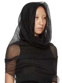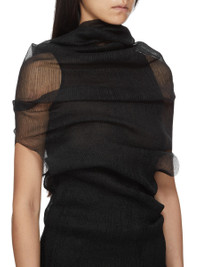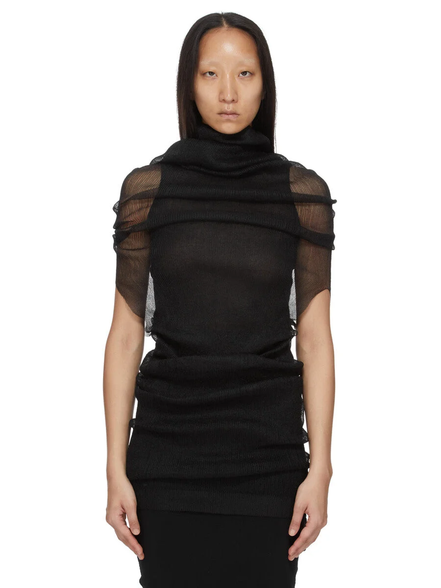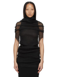 RICK OWENS SS26 TEMPLE TRANSPARENT TUBE IN BLACK RIBBED KNIT THIS TRANSPARENT TUBE IS A PULL ON TOP THAT DRAPES DOWN TO BELOW HIP LENGTH. IT FITS OVER THE HEAD AND SHOULDERS REVEALING THE ARMS AT ELBOW LENGTH. IT HAS A COWL NECK THAT CAN BE WORN DRAPED TOWARDS THE BACK, OR USED AS A HOOD. IT IS COMPLETELY TRANSPARENT. THIS RIBBED LIGHTWEIGHT AND CLASSIC STITCH POLYESTER KNIT HAS A SOFT HANDFEEL. COLOR: BLACK MATERIAL:100% POLYESTER MODEL IS 181CM TALL MODEL WEARS SIZE S