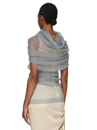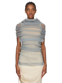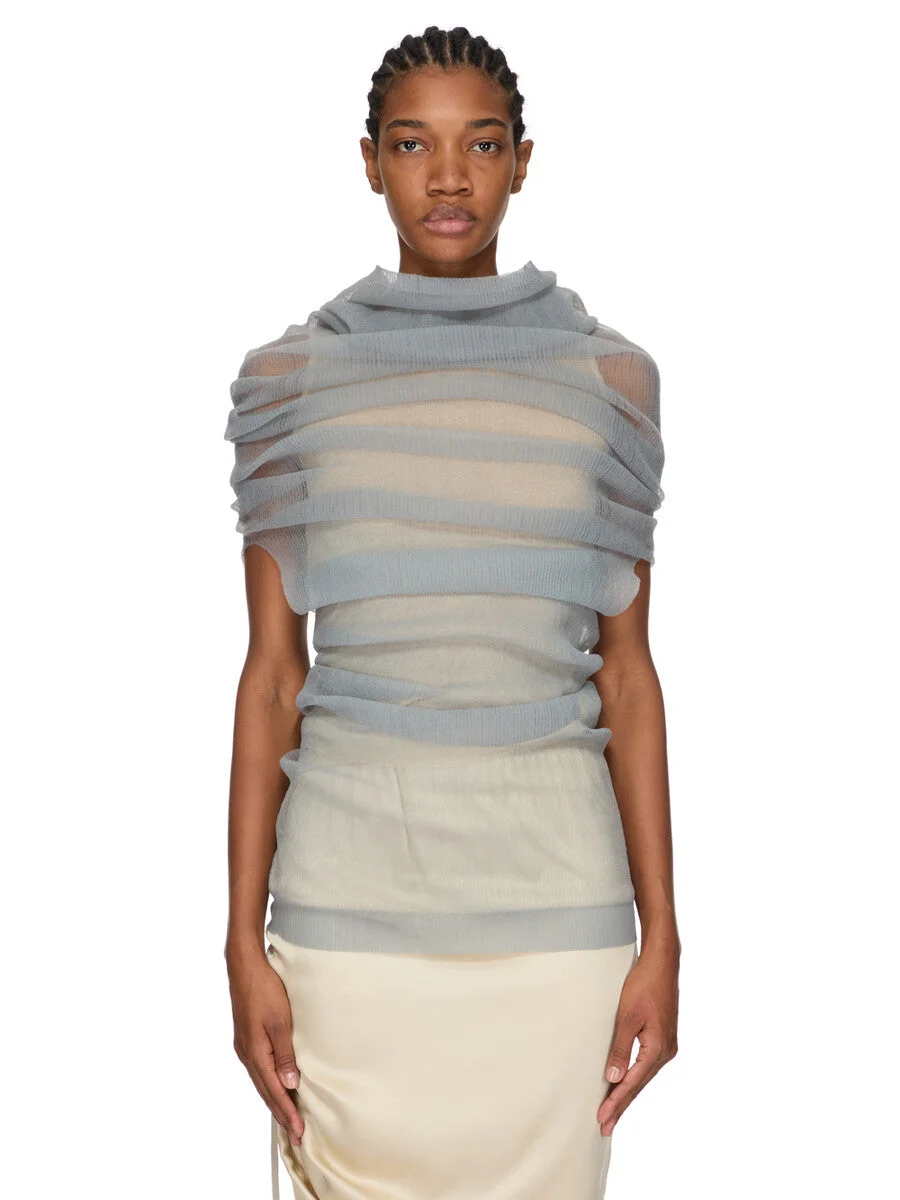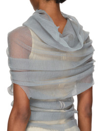 RICK OWENS SS26 TEMPLE TRANSPARENT TUBE IN PEARL RIBBED KNIT THIS TRANSPARENT TUBE IS A PULL ON TOP THAT DRAPES DOWN TO BELOW HIP LENGTH. IT FITS OVER THE HEAD AND SHOULDERS REVEALING THE ARMS AT ELBOW LENGTH. IT HAS A COWL NECK THAT CAN BE WORN DRAPED TOWARDS THE BACK, OR USED AS A HOOD. IT IS COMPLETELY TRANSPARENT. THIS RIBBED LIGHTWEIGHT AND CLASSIC STITCH POLYESTER KNIT HAS A SOFT HANDFEEL. COLOR: PEARL MATERIAL:100% POLYESTER MODEL IS 181CM TALL MODEL WEARS SIZE S