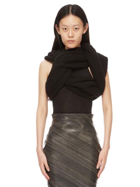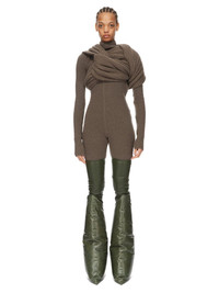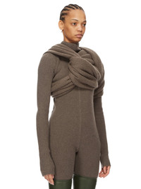 RICK OWENS FW24 PORTERVILLE TRIPLE DONUT IN DUST RASATO CASHMERE KNIT THIS TRIPLE DONUT IS THREE INTERLINKED KNIT TUBES WHICH CAN BE WORN WRAPPED MULTIPLE WAYS AROUND THE BODY THIS MEDIUMWEIGHT RASATO CASHMERE KNIT HAS A SOFT WARM HANDFEEL COLOR: DUST MATERIAL: 100% CASHMERE MODEL IS 181CM TALL ITEM IS AVAILABLE IN ONE SIZE
