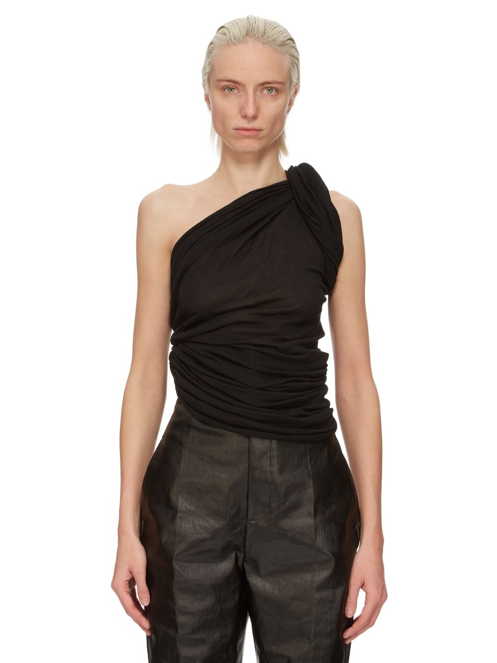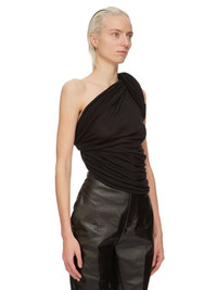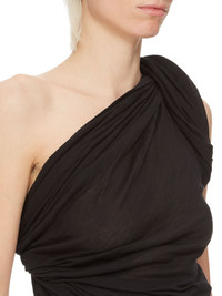 RICK OWENS FW24 PORTERVILLE TWIST T IN BLACK UNSTABLE COTTON THIS TWIST T IS WAIST LENGTH AND SLEEVELESS. IT HAS A TIGHT FITTING BODY, WITH DRAPING GATHERING INTO AN ASYMMETRICAL RIGHT SHOULDER AND TWISTING AROUND TO CIRCLE THE RIGHT ARM THIS LIGHTWEIGHT COTTON JERSEY IS SEMI-TRANSPARENT WITH A SOFT HANDFEEL. THIS JERSEY IS MADE USING GOTS CERTIFIED ORGANIC COTTON WHICH MEANS THE NATURAL FIBER IS GROWN WITHOUT HARMFUL CHEMICALS, LEAVING OUR SOIL, AIR AND WATER CLEANER FROM CONTAMINATES. WE STRIVE TO KEEP OUR PRODUCTION AS LOCAL AS POSSIBLE. THE FULL MANUFACTURING CYCLE OF THIS PRODUCT, FROM THE MATERIAL KNITTING TO SEWING AND FINISHING, WAS UNDERTAKEN CLOSE TO OUR HOME BASE IN CONCORDIA, ITALY - COLOR: BLACK - MATERIAL: 100% COTTON - MODEL IS 181CM TALL - MODEL WEARS SIZE 40
