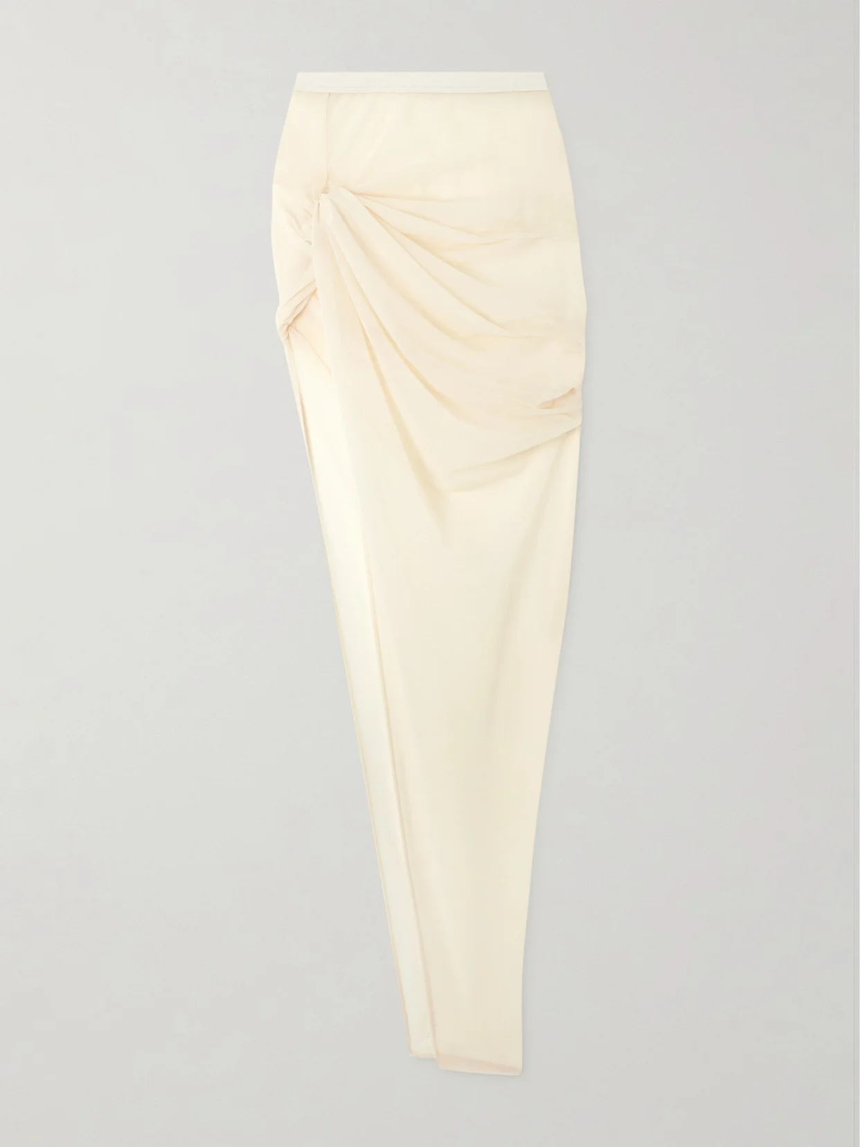 Rick Owens' skirt is made from lightweight jersey that's artfully twisted at the hip, creating a leg-baring split and effortless drape. Temper the semi-sheer finish with tonal underpinnings.