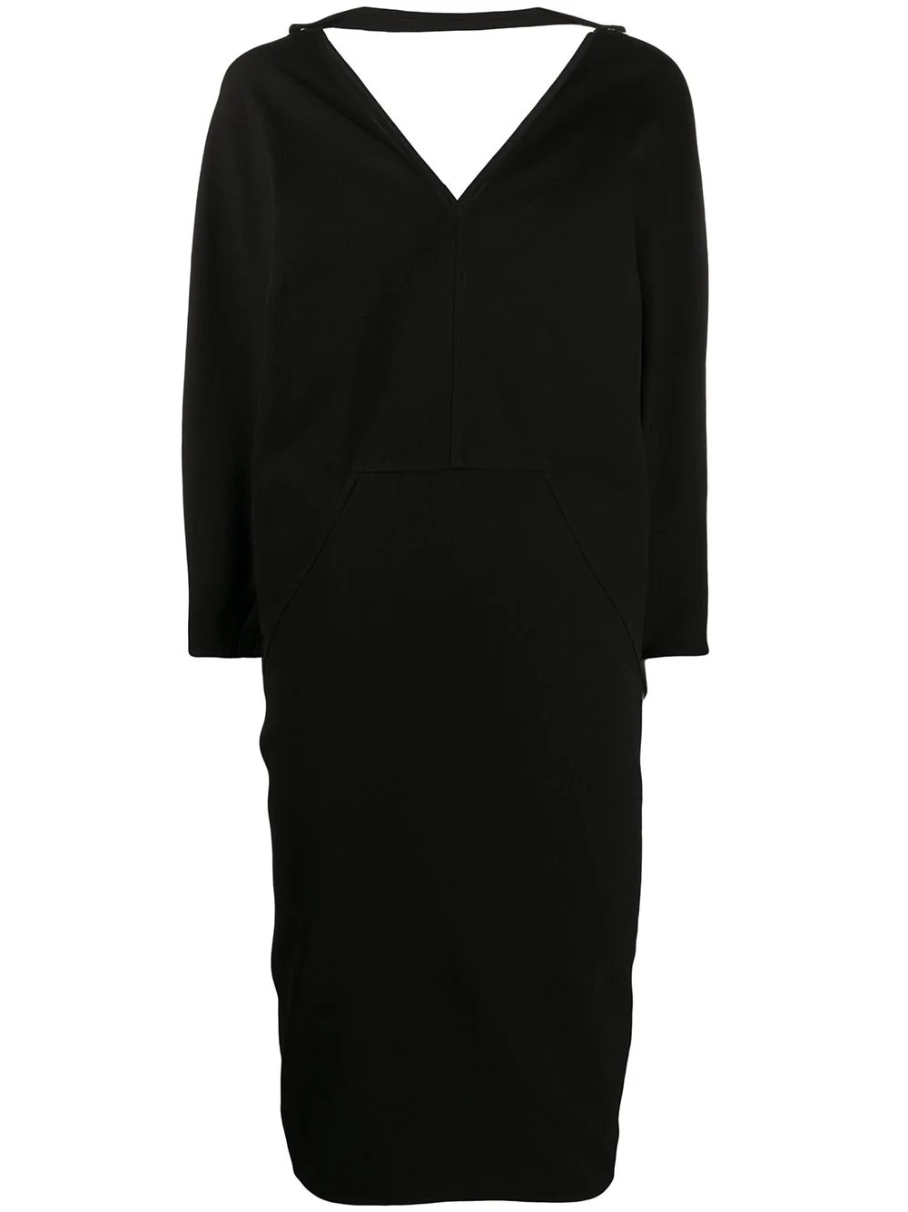 V-neck midi dress Black cotton-blend V-neck midi dress from Rick Owens featuring a v-neck, a v-back, batwing sleeves, stitched panels and a back neck strap. Made in Italy Composition Cotton 64%, Viscose 34%, Polyamide 1%, Spandex/Elastane 1% SIZE & FIT Model measurements Height 5 ft 10 in(1.79 m) Bust/Chest 31.88 in(81 cm) Hips 35.43 in(90 cm) Waist 23.62 in(60 cm) FittingInformation This piece fits true to size. We recommend you get your regular size Designed for a loose fit at the bust and waist with a close fit on the hips Made with a mid-weight stretch fabric Washing instructions Dry Clean Only