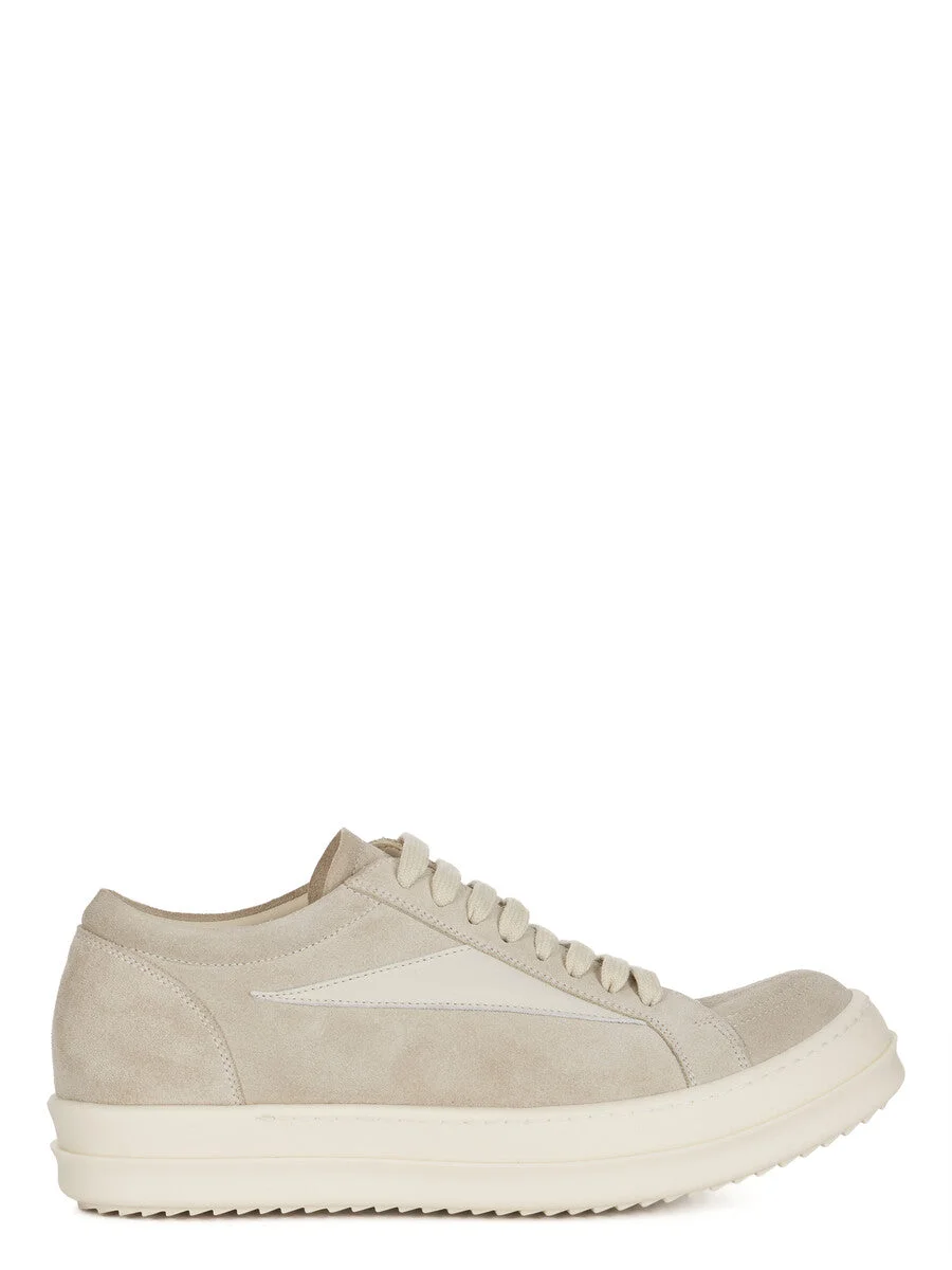 RICK OWENS SS26 TEMPLE VINTAGE SNEAKS IN PEARL/DIRTY MILK/MILK SUEDE LEATHER AND FULL GRAIN CALF LEATHER THESE VINTAGE SNEAKS ARE UNDER-ANKLE HEIGHT AND HAVE EIGHT EYELETS WITH LACES, TOE CAPS AND SHARK-TOOTHED BUMPER SOLES. THEY FEATURE A TRIANGULAR LEATHER APPLIQUE ON THE SIDE FOOT, A PADDED ANKLE AND CONTRAST STITCHING. THIS IS A COMBINATION OF SUEDE LEATHER AND FULL GRAIN CALF LEATHER. THIS MEDIUMWEIGHT CROSTA SUEDE LEATHER IS MATTE WITH A HAIRY SURFACE TEXTURE. IT HAS A NATURAL AND WAXY HAND FEEL ACHIEVED BY DRUMMING THE SKINS WITH WAX. THIS TANNERY IS LWG CERTIFIED WITH A SILVER RATING. COLOR: PEARL/DIRTY MILK/MILK MATERIAL: UPPER 100% CALF LEATHER LATERAL DETAILS 100% COW LEATHER LINING 100% CALF LEATHER INSOLE 100% CALF LEATHER SOLE 100% THERMOPLASTIC RUBBER