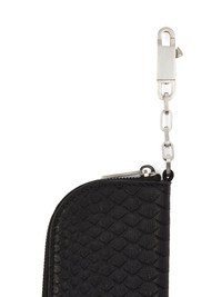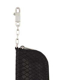 RICK OWENS SS25 HOLLYWOOD HOOK WALLET IN BLACK OILY PYTHON THIS HOOK WALLET IS RECTANGULAR AND HAS ONE ROUNDED CORNER AND A ZIPPER CLOSURE. IT HAS A CHAIN WITH A SMALL PALLADIUM TONE BRASS HOOK THIS MEDIUMWEIGHT PYTHON SNAKESKIN HAS A WAXY HAND FEEL AND MATTE FINISH. PYTHON IS PROTECTED BY THE CITIES AGREEMENT AND REGULATIONS, WHICH MEANS EACH SKIN CAN BE TRACED BACK TO ITS ORIGIN COLOR: BLACK MATERIAL: 100% PYTHON LEATHER LINING 100% LAMB LEATHER WIDTH 7,5CM / HEIGHT 12CM / DEPTH 1CM