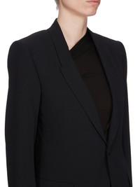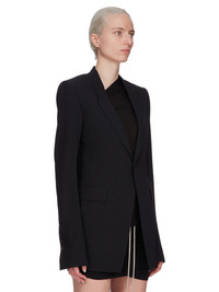 RICK OWENS SS25 HOLLYWOOD EXTREME SOFT BLAZER IN BLACK LIGHT POUDRE THIS EXTREME SOFT BLAZER IS BELOW-HIP LENGTH WITH LONG, SLIM SLEEVES WITH A TAILORED UNDERARM GUSSET. IT HAS BUTTON CUFFS, A SLIM LAPEL WITH A SINGLE BUTTON CLOSURE, TWO LOWER SIDE FRONT POCKETS WITH FLAPS, AND A DOUBLE VENT ON BACKIT IS FULLY LINED AND HAS TWO INTERNAL BUTTONED POCKETS THIS MEDIUMWEIGHT GRAIN DE POUDRE WOOL IS MATTE AND HAS A SOFT AND FLUID HAND FEEL. COLOR: BLACK MATERIAL: 100% WOOL FRONT AND POCKETS LINING 100% COTTON BACK AND SLEEVES LINING 100% CUPRO BUTTONS 100% BUFFALO HORN MODEL IS 181CM TALL MODEL WEARS SIZE 40