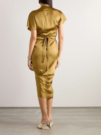 EDITORS'NOTES Rick Owens is all about effortlessly elegant pieces like this midi dress. It's cut from fluid satin that's beautifully draped at the front and ties at the waist. SIZE & FIT Model measurements: - Fits true to size, take your normal size - Wraparound design, fastens at the waist - Lightweight, fluid, non-stretchy fabric - Model is 175cm/ 5'9" and is wearing an IT 40 - Bust: 78cm/ 31" - Waist: 62cm/ 24.5" - Hip: 92cm/ 36" DETAILS & CARE - Gold satin - Ties at waist - 61% acetate, 39% viscose - Dry clean