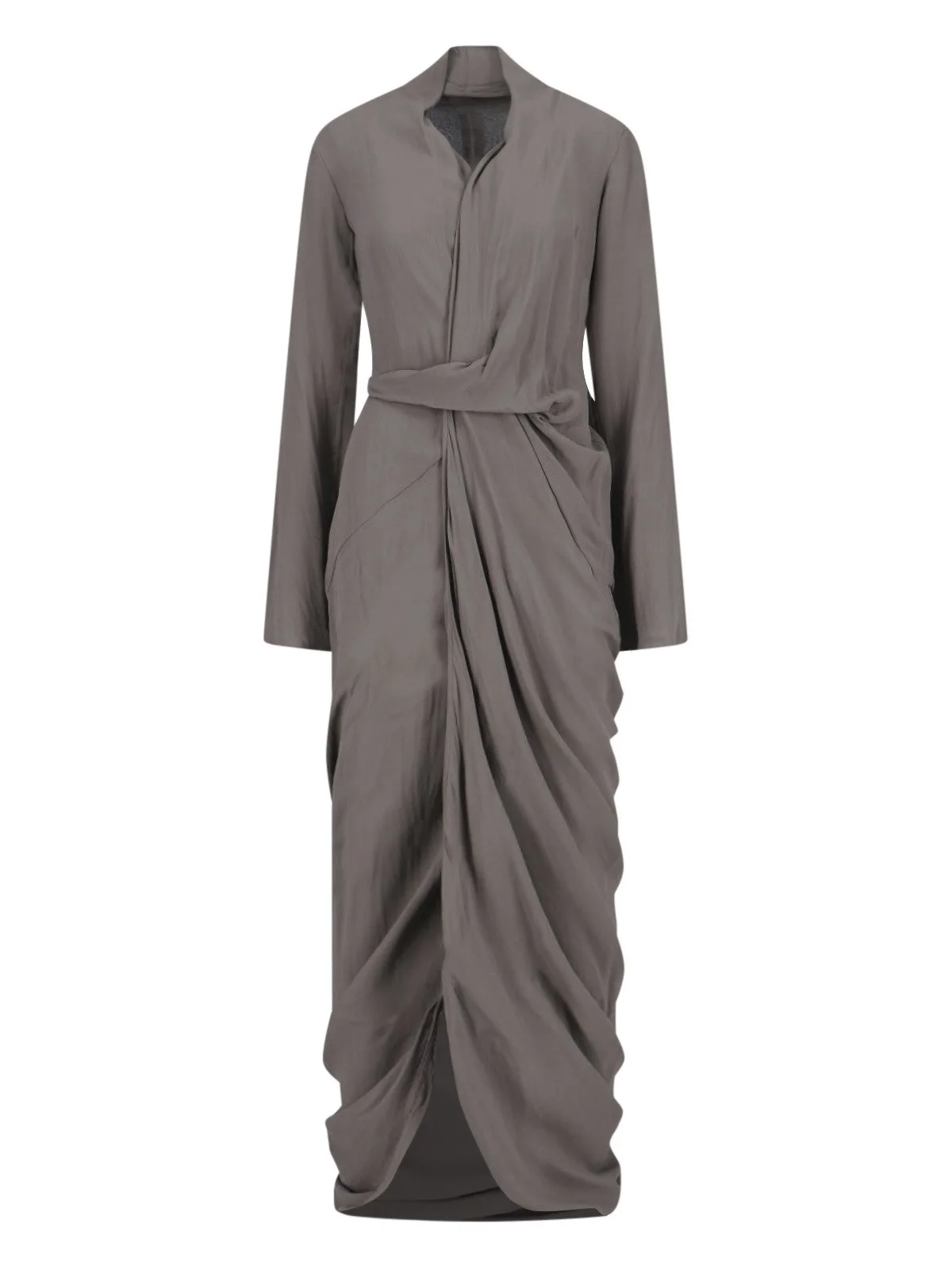 RICK OWENS 'WRAPPED' MAXI DRESS IN LIGHT BROWN CUPRO, V-NECK, BACK BELT CLOSURE, DRAPED DETAILS, IRREGULAR HEM. PRODUCT INFO PRODUCT CODE RP01F6566 G34 COMPOSITION: 100% SILK SIZE AND FIT: REGULAR FIT MADE IN: ITALY