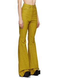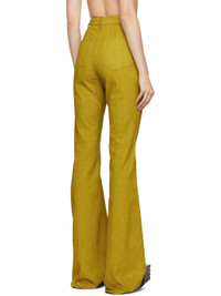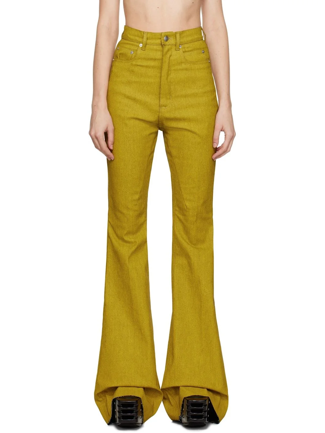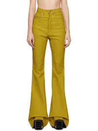 Slim-fit and bootcut lightweight stretch cotton-blend denim jeans. Matte rubber coating and distressing throughout. · High-rise · Belt loops · Five-pocket styling · Zip-fly · Darts at inseam and back waistband · Raw edge at cuffs Supplier color: Lemon Body: 91% cotton, 6% elastomultiester, 3% rubber. Lining: 100% cotton. Made in Italy 242232F069008