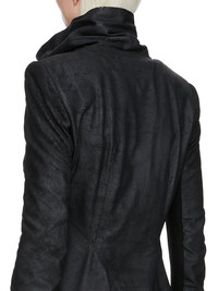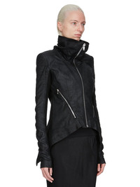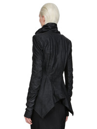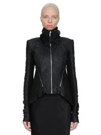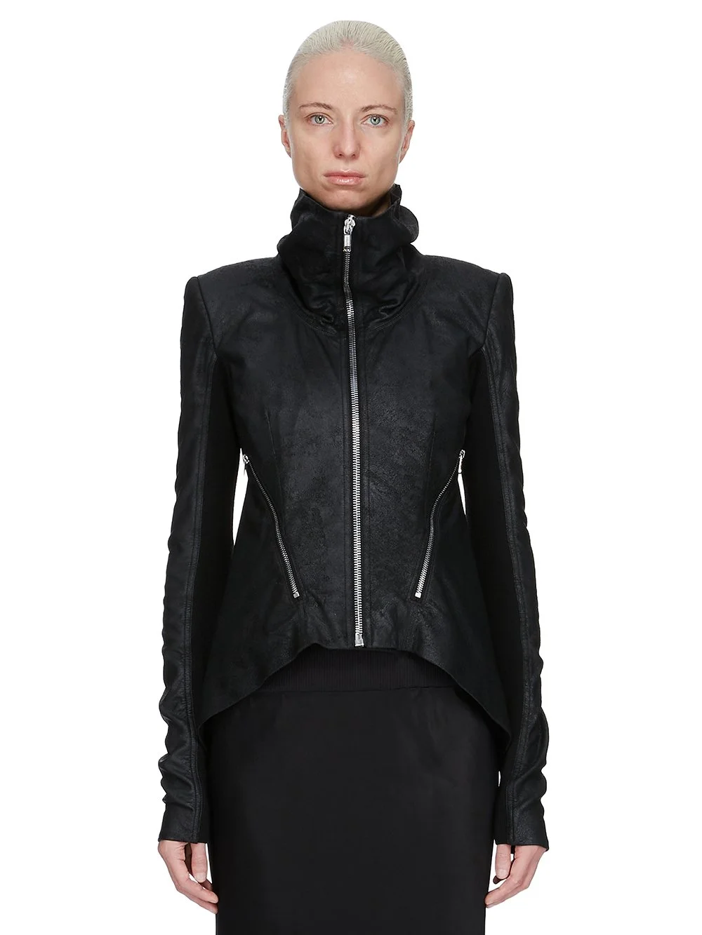 RICK OWENS FW25 CONCORDIANS ZIPFRONT NASKA BIKER IN BLACK BLISTER LAMB LEATHER THIS ZIPFRONT NASKA BIKER IS BELOW WAIST LENGTH. IT FEATURES A CENTRE FRONT ZIPPER, CREATING A HIGH FUNNEL NECK. IT HAS TWO FRONT SIDE BIAS ZIPPERED POCKETS, LONG SLIM SLEEVES WITH AN UNDERSIDE IN KNIT AND A CURVED NASKA HEMLINE THAT DIPS INTO TWO POINTS AT THE BACK. IT IS FULLY LINED AND HAS INTERNAL BUTTONED POCKETS THIS LIGHTWEIGHT LAMB LEATHER HAS AN EXAGGERATED UNEVEN BLISTERED TEXTURE AND A SOFT, FLUID HANDFEEL. THE BLISTERED TEXTURE IS ACHIEVED BY EXAGGERATING THE NATURAL GRAIN TEXTURE OF EACH SKIN, THEREFORE THE LOOK OF EACH SKIN IS UNIQUE. THIS LEATHER IS MADE BY A THIRD GENERATION FAMILY OWNED TANNERY IN THE SOUTH OF ITALY. COLOR: BLACK MATERIAL: 100% LAMB LEATHER MODEL IS 181CM TALL MODEL WEARS SIZE 40