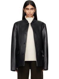 Grained leather jacket. · Band collar · Button closure · Flap pockets · Full bonded suede lining Supplier color: Black 100% leather. Made in Italy 242661F064000