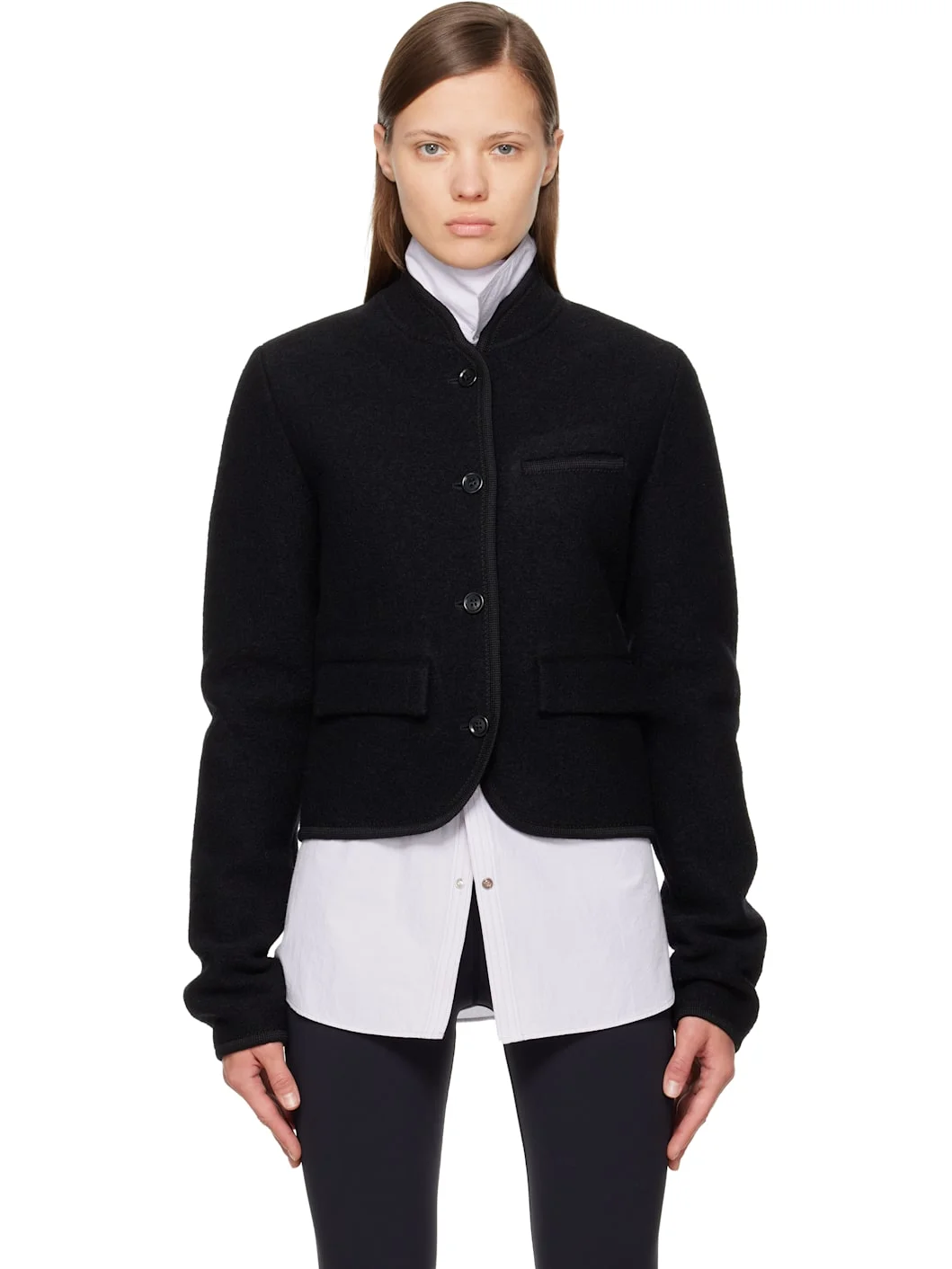 Lightweight felted wool jacket. · Stand collar · Button closure · Welt pocket at chest · Flap pockets at waist · Corozo hardware Supplier color: Black felted 100% wool. Made in Austria 252661F063001