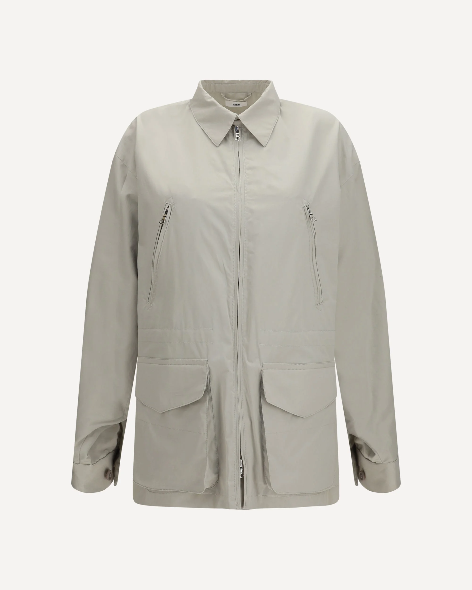 The cotton zipped pockets Jacket by Rier stands out for a functional silhouette that interprets contemporary style with an essential attitude. The jacket model by Rier features a pointed collar and long sleeves that define the structure of the garment. The front zip closure adds practicality to the design. Front pockets and chest zip pockets introduce functional and dynamic details. The cotton jacket by Rier completes the design with a versatile and modern silhouette. DETAILS - Sku: OTW3COS_LIGHTGREYS - Season: SS26 - Fit: Regular - Composition: GENERAL 100% Cotton - MADE IN AUSTRIA