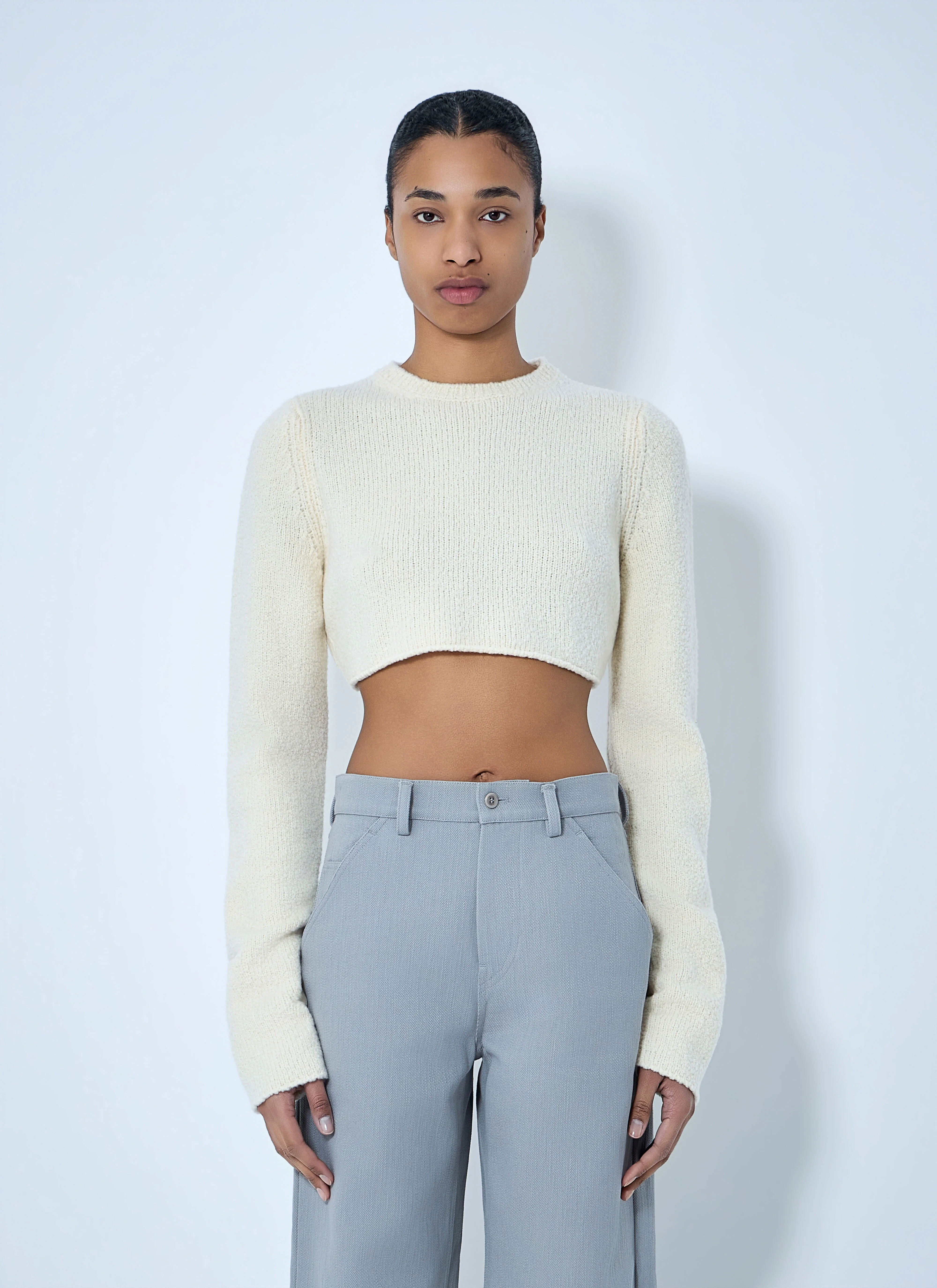 Cropped knit sweater with crewneck and long sleeves. - Crewneck design - Cropped length - Long sleeves - 100% Wool - Color: Beige - Code: KNW72 WVB - WOOL BOUCLE BUTTER BOUCLE