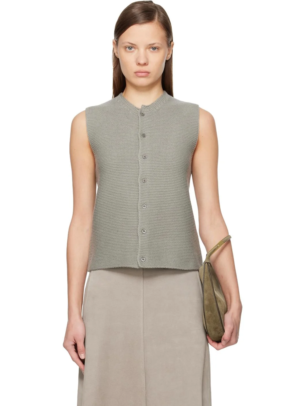 Knit wool vest-style cardigan. · Rib-knit round neck · Button closure · Mother-of-pearl hardware Supplier color: Camoscio 100% wool. Made in Italy 252661F095002
