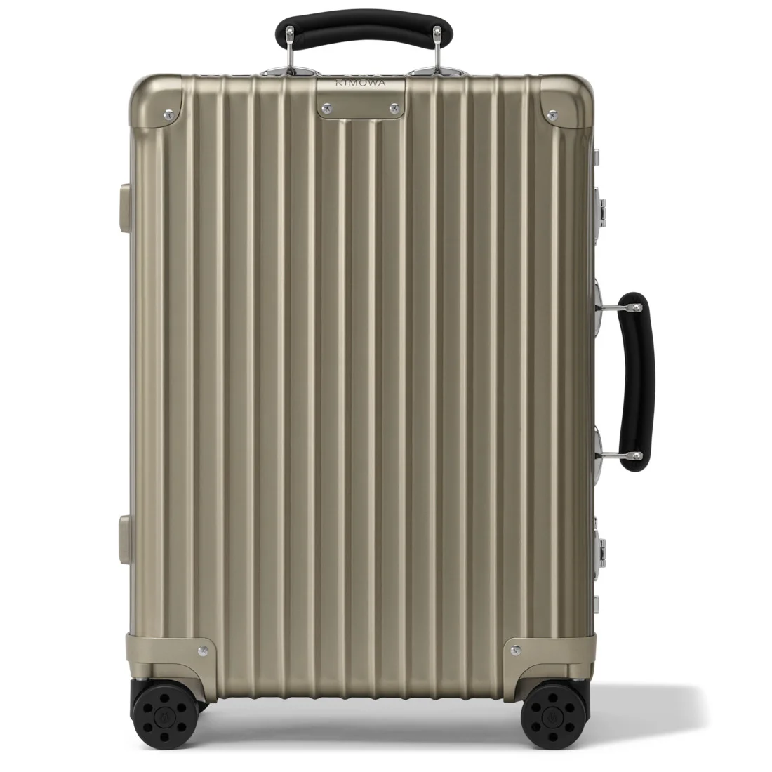 Crafted in high-end anodized aluminum with leather handles, the RIMOWA Classic blends heritage design with precision engineering – a timeless choice for discerning travelers. Within a range of sizes, find your trusted companion and customize it with colorful RIMOWA UNIQUE accessories to create a suitcase that is unmistakably yours. Ideal for 3 to 4 days of travel, the RIMOWA Classic Cabin in titanium features several ingenious functionalities: - Stage-free telescopic handle - RIMOWA Multiwheel® System - TSA-approved locks - Flex Divider Includes a complimentary leather luggage tag and a sticker. Designed in Germany. Produced in our RIMOWA factories. Video: The models are 183cm-6'0" tall (man) and 174cm-5'9" tall (woman). Key elements TSA-Approved Locks Each of our suitcases features TSA-approved locks that can be opened by security during airline baggage checks without causing any damage. Flex Divider Packed items are kept in perfect order during transit with the height adjustable Flex Divider, which can be adapted to suit your belongings. RIMOWA Multiwheel® System Pioneered by RIMOWA, this high-end system guarantees stable and effortless steering thanks to ball-bearing mounted wheels with cushioned axels. Telescopic Handle Engineered to offer a stageless handle for custom height adjustment and an ergonomic grip with a leather insert on the underside for optimum comfort. Size and Weight Measurement 21.7 x 15.8 x 9.1 inch Weight 9.5 lbs Volume 9.5 gal Materials Outside: Aluminum Inside: Polyester Handles: Leather Wheels: Hard plastic Dividers: Polyester