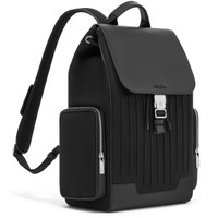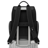 Made in Italy and crafted from canvas and full-grain leather, the Never Still - Canvas Flap Backpack Large in black is designed to be a versatile daily and travel bag for those always on the go. This soft canvas backpack, secured by a speed clip buckle and featuring a padded back for maximum comfort, is the perfect companion for every occasion while offering a wide range of additional functionalities: - Two external side zipped pockets - Adjustable shoulder straps for a personalized fit (min 8.7", max 16.1") - Suitcase attachment sleeve - Large drawstring compartment - 16-inch laptop-sized padded pocket Includes a complimentary leather tag, which is removable and customizable. The Never Still Flap Backpack Large is part of the RIMOWA Never Still collection, where functionality is at the core of every design. The collection’s signature grooved surfaces offer a reinterpretation of the iconic pattern found on our suitcases. Video: The model is 190cm-6'2". Displayed on a RIMOWA Original Cabin suitcase. Photo: The model is 188cm-6'2". Key elements Bespoke Clip Buckle Bespoke speed clip buckle with RIMOWA monogram emblazoned. Padded Back & Adjustable Buckle Engineered to offer additional support for maximum comfort on the go. Suitcase Attachment Sleeve Make the bag even easier to carry on your travels by attaching it to your suitcase's telescopic handle. Removable Leather Tag A removable and customizable leather tag. Size and Weight Measurement 17.3 x 14.6 x 6.3 inch Weight 2.9 lbs Materials Exterior: Full-Grain leather & Canvas Interior: Textile Hardware finishing touch: Palladium-colored hardware