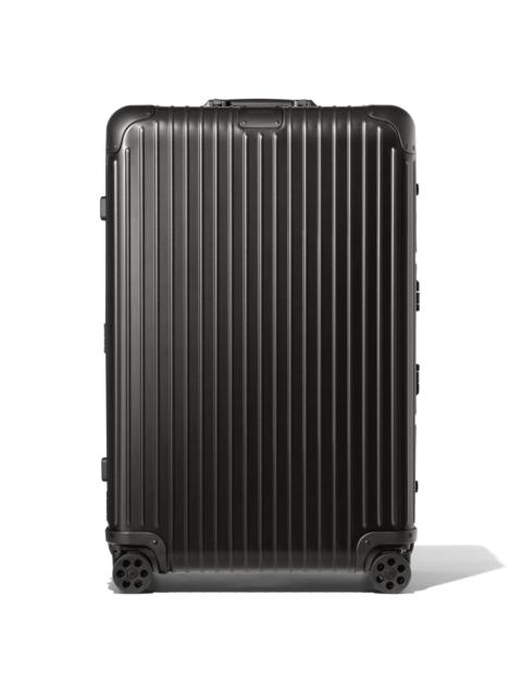 The unmistakable RIMOWA Original aluminum suitcase with its distinctive grooves is regarded as one of the most iconic luggage designs of all time. Made from high-end anodized aluminum, the RIMOWA Original Check-In L in silver is engineered with longevity in mind. Remarkably robust and surprisingly lightweight, this large suitcase is an unparalleled example of craftsmanship and innovation and is built to provide room for up to 10 days of travel. Designed and engineered in Germany. Includes a complimentary leather luggage tag and sticker set. Key elements TSA-Approved Locks Each of our suitcases features TSA-approved locks that can be opened by security during airline baggage checks without causing any damage. Flex Divider Packed items are kept in perfect order during transit with the height adjustable Flex Divider, which can be adapted to suit your belongings. Multiwheel® System Pioneered by RIMOWA, this high-end system guarantees stable and effortless steering thanks to ball-bearing mounted wheels with cushioned axels. Telescopic Handle Engineered to offer seamless stage-free adjustment for maximum comfort and smooth manoeuvrability. Size and Weight Measurement 31,2 x 20,1 x 10,7 INCH Weight 13,7 Lbs Volume 21,7 Gal Materials Outside: Aluminum Inside: Cotton Zippers: KK Metal Handles: Plastic Wheels: Polycarbonate Dividers: Cotton