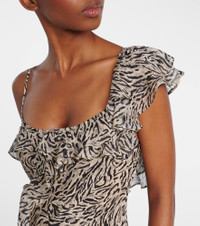Inspired by '90s silhouettes, the Ester maxi dress from Rixo is made from lightweight silk crepe de chine and features an asymmetric design. Ruffles start at one shoulder and cascade down the length to the front vent. Product Details - Material: 100% silk - Care instructions: dry clean - Made in China - Designer color name: Sun Leo Tan - Item color: beige, black - Trim: 100% viscose - Long vent - Item number: P01084117 Size & Fit - True to size - Low back - Cinched waist - Non-stretchy fabric - The model seen in the picture is 178cm-5'10" and wearing a size XS