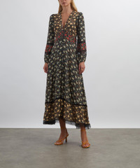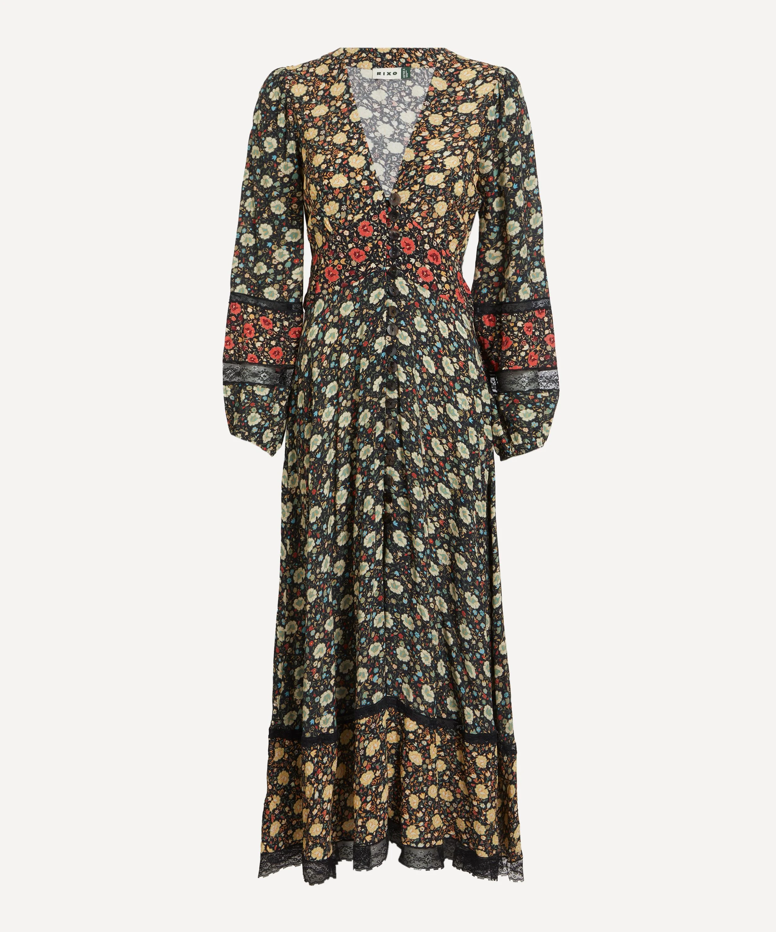 DETAILS Crepe de chine dress Fits true to size Midi length Long sleeves Elasticated cuffs V-neckline Empire waist Bias-cut skirt Lace trims Eva Floral Mix Black print SIZE & FIT Model is 179cm/5'10.5"; Chest: 81cm; Waist: 64cm; Hip: 89cm and wears a size 8 COMPOSITION & CARE 100% Viscose Dry clean