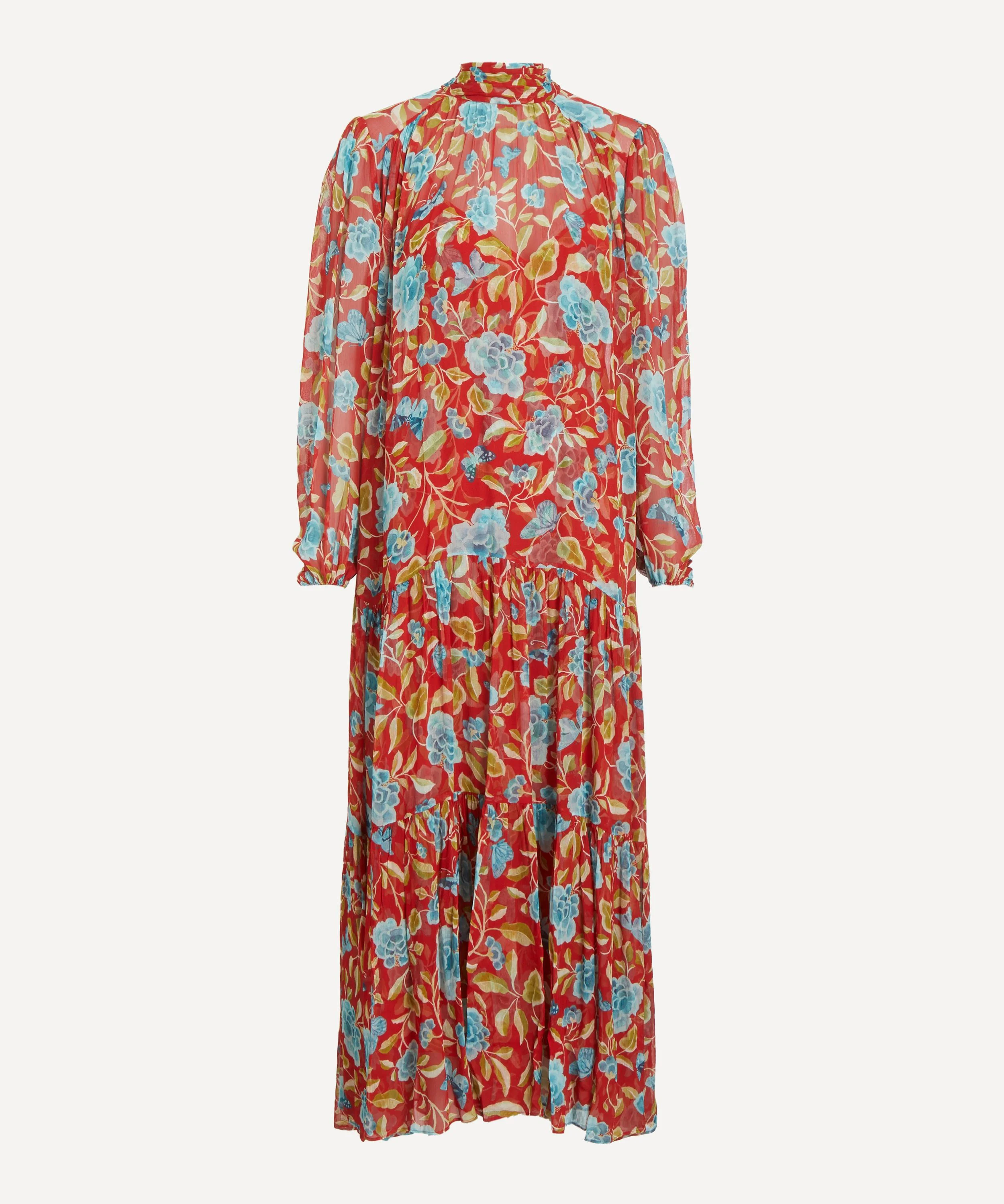 DETAILS Crinkled chiffon dress Fits true to size Midi length Long blouson sleeves High neckline with pussybow ties to the reverse Dropped waist Loose, floaty skirt Butterfly Floral Burgundy print SIZE & FIT Model is 175cm/5'9"; Chest: 76cm; Waist: 58cm; Hip: 90cm and wears a size 8 COMPOSITION & CARE Outer: 100% Viscose Slip: 60% Rayon; 40% Viscose Dry clean